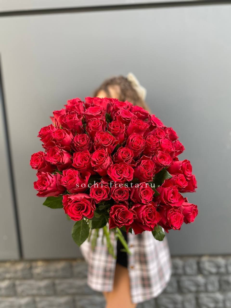 Пятьдесят одна роза насыщенного красного оттенка собрана в плотную композицию. Упаковка мягко обрамляет бутоны, сохраняя естественную форму и создавая цельный силуэт.