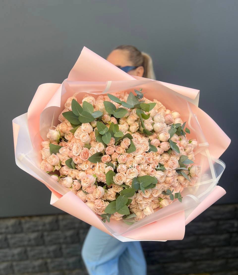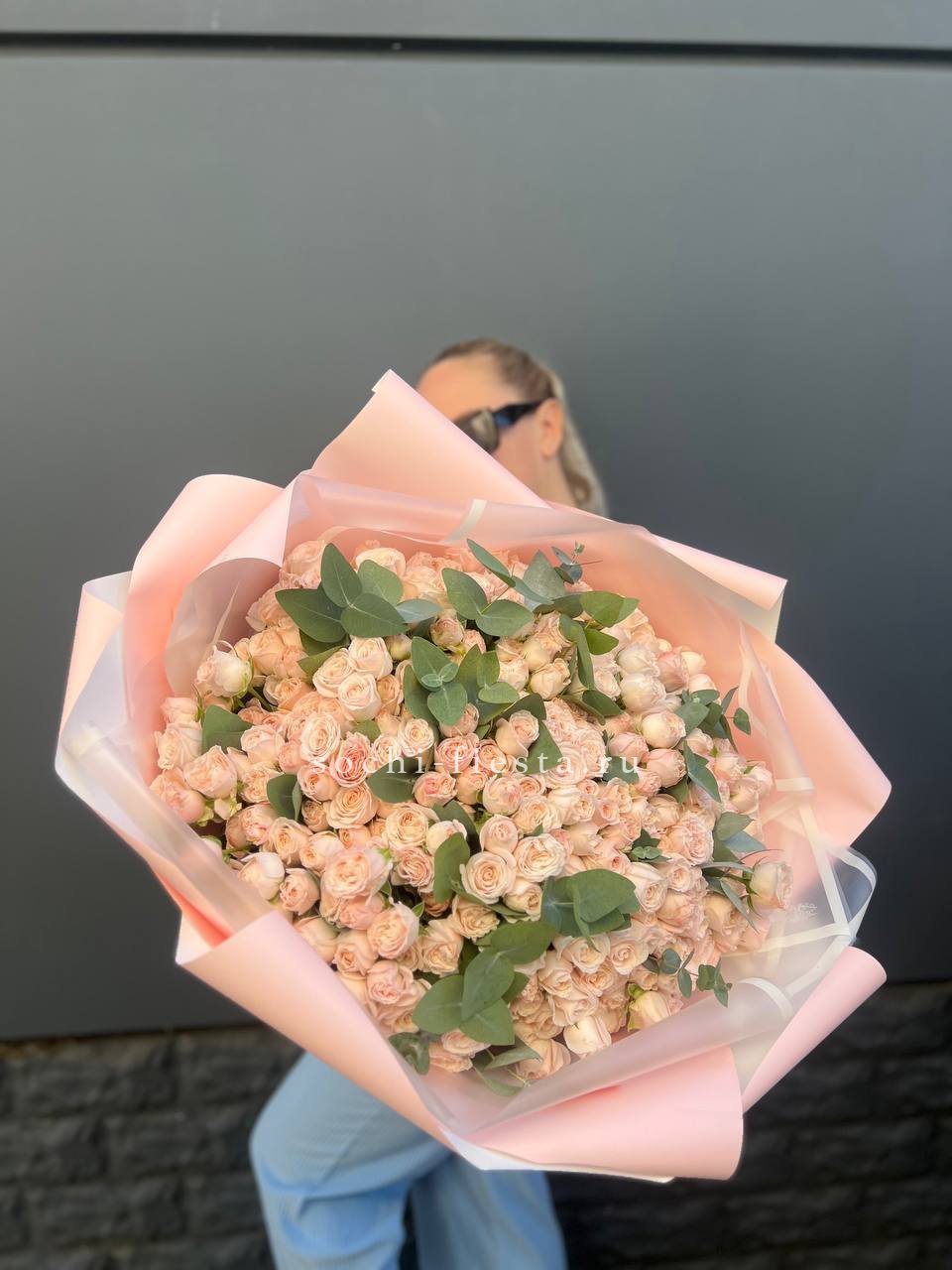 Пятнадцать вывернутых роз Джумилия раскрывают свою многослойную структуру в каждом бутоне. Эвкалипт обрамляет композицию, подчёркивая фактуру лепестков.
