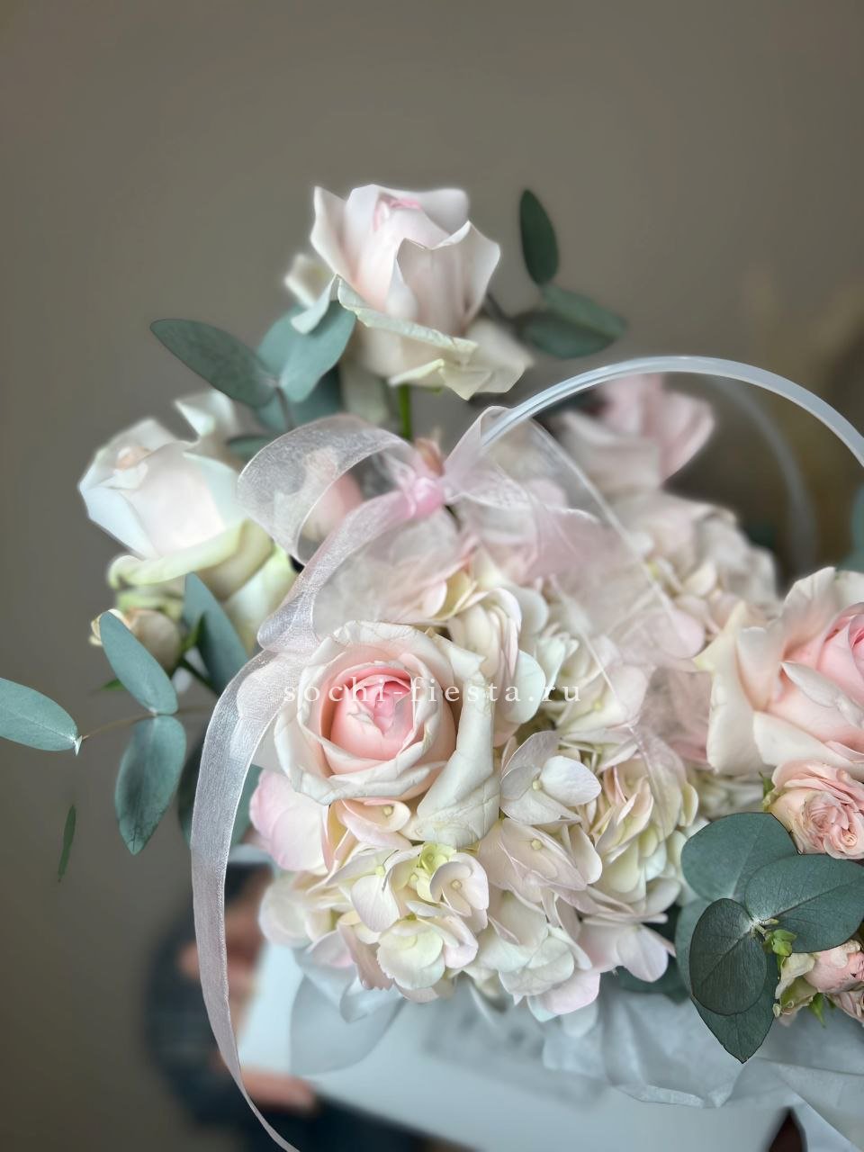 Воздушная палитра белого с голубыми переливами дарит ощущение прохлады и свежести. Пять соцветий гортензии образуют мягкую композицию, где каждый оттенок перетекает в другой, создавая глубину.