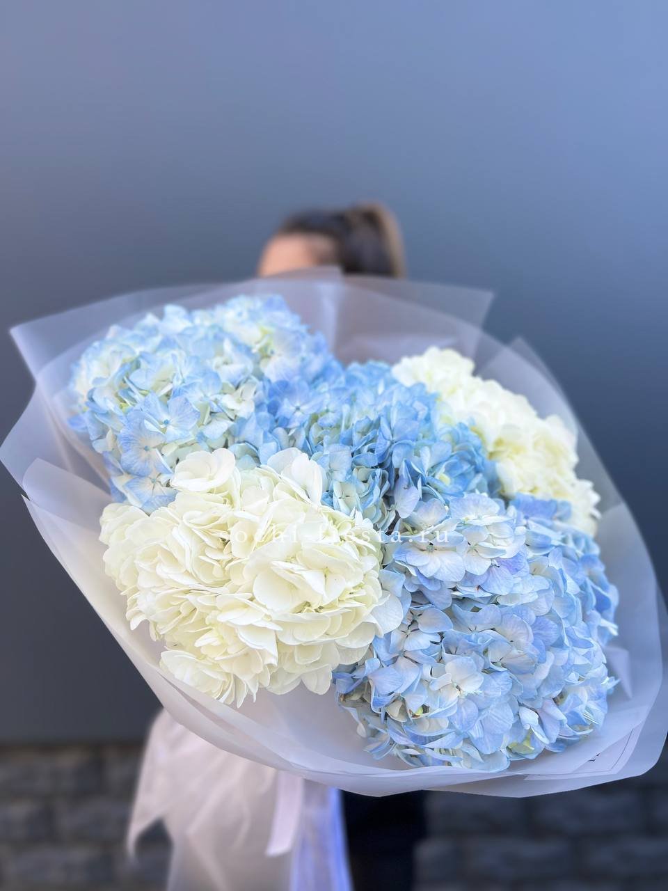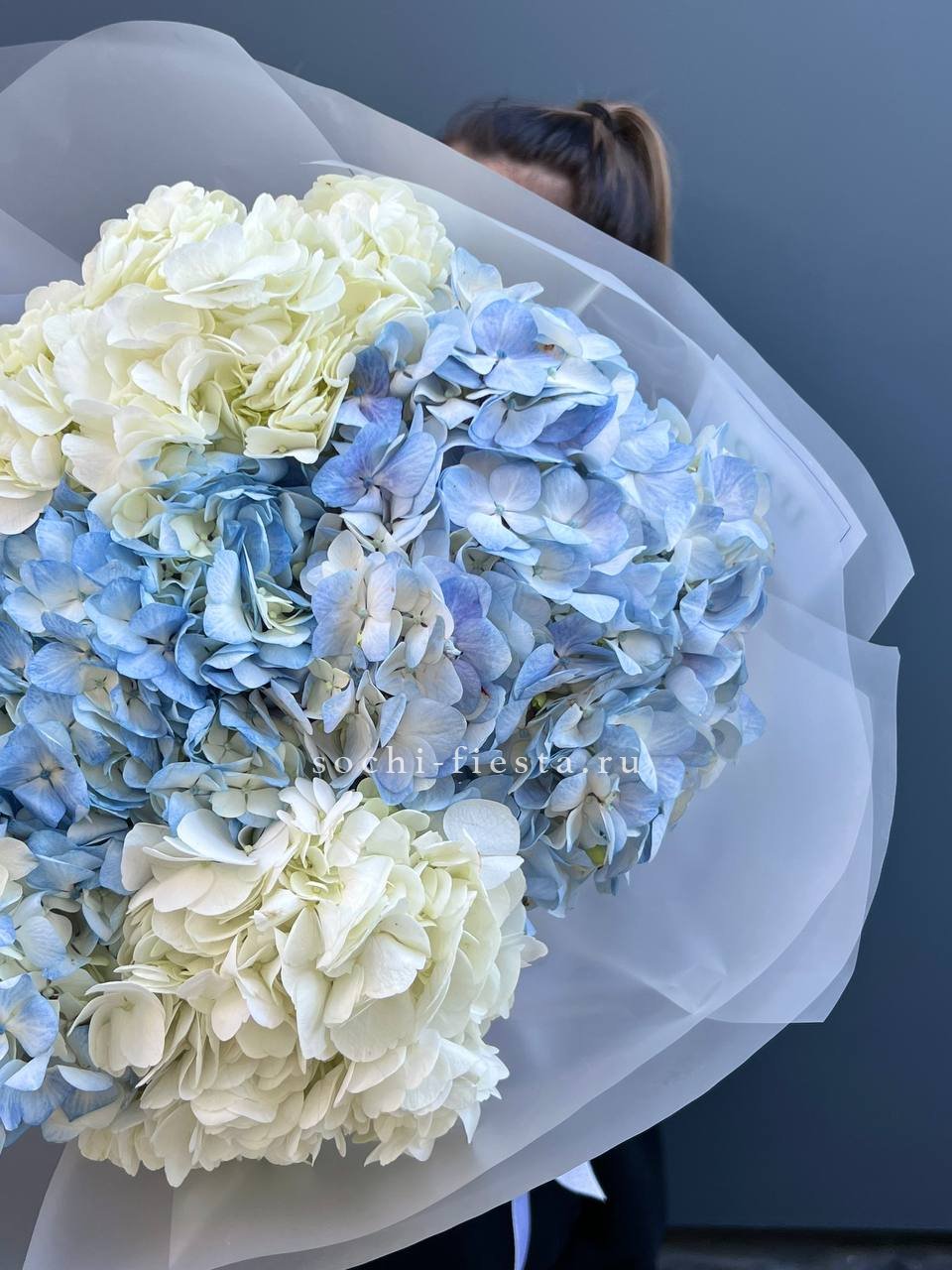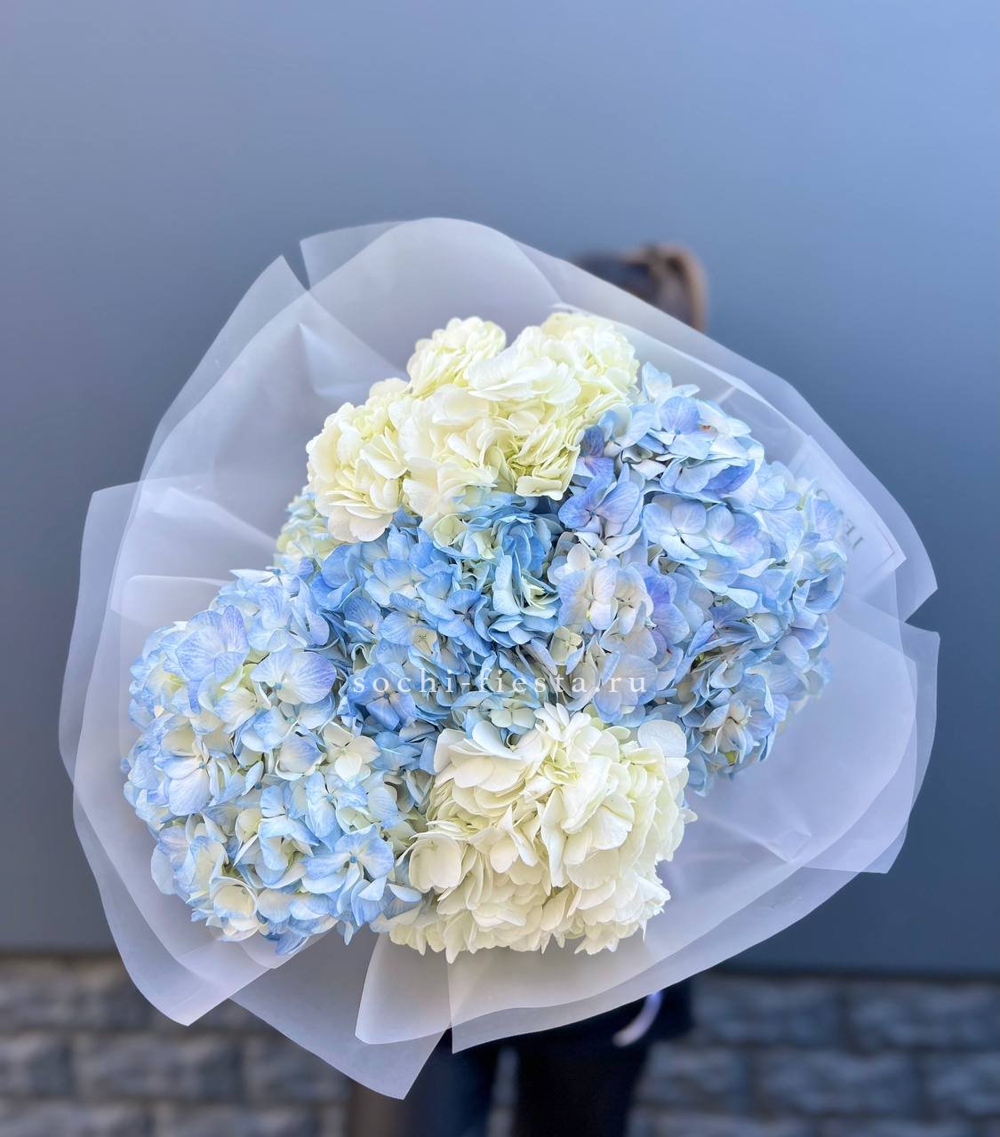 5 бело-голубых гортензий
