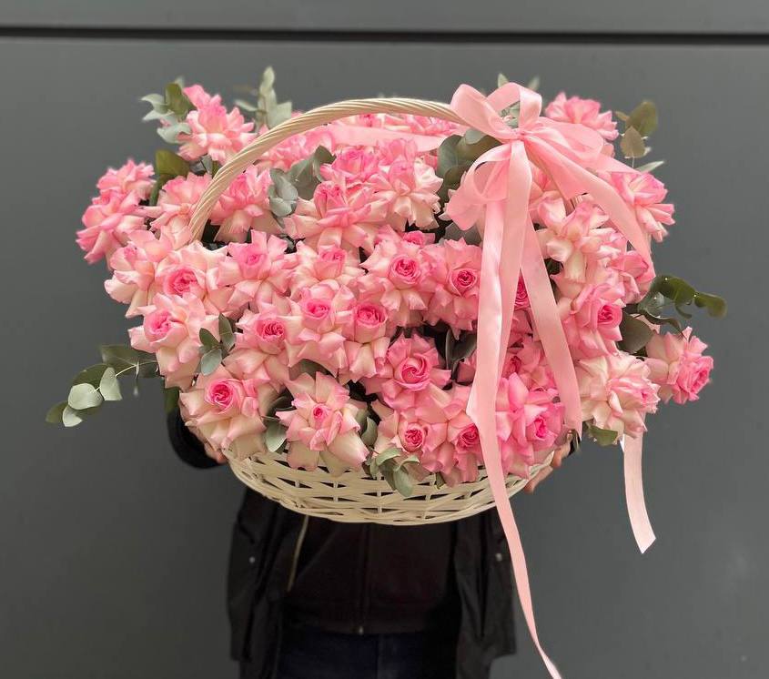 розовые розы, эвкалипт, пленка, корзина.