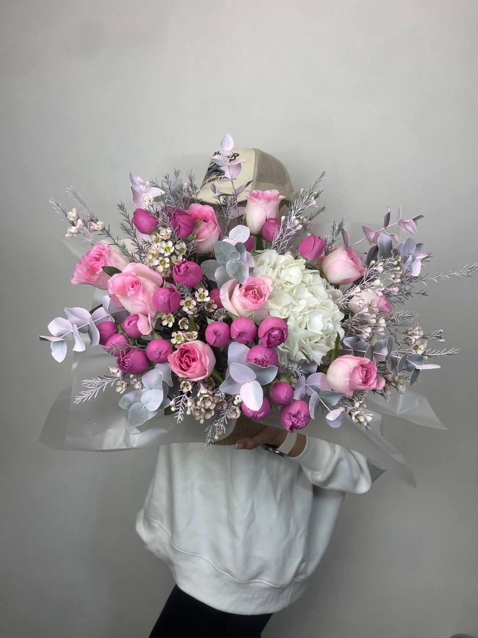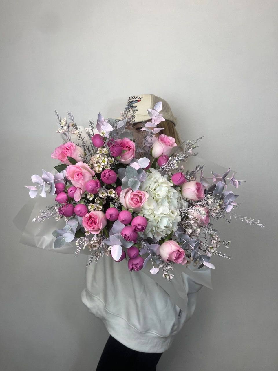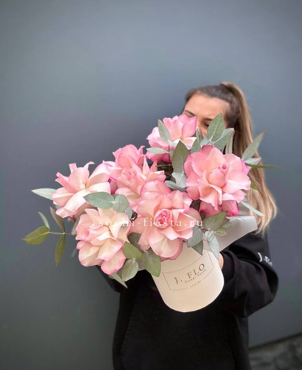 вывернутые розы, цилиндр D13, эвкалипт, лента, упаковка.