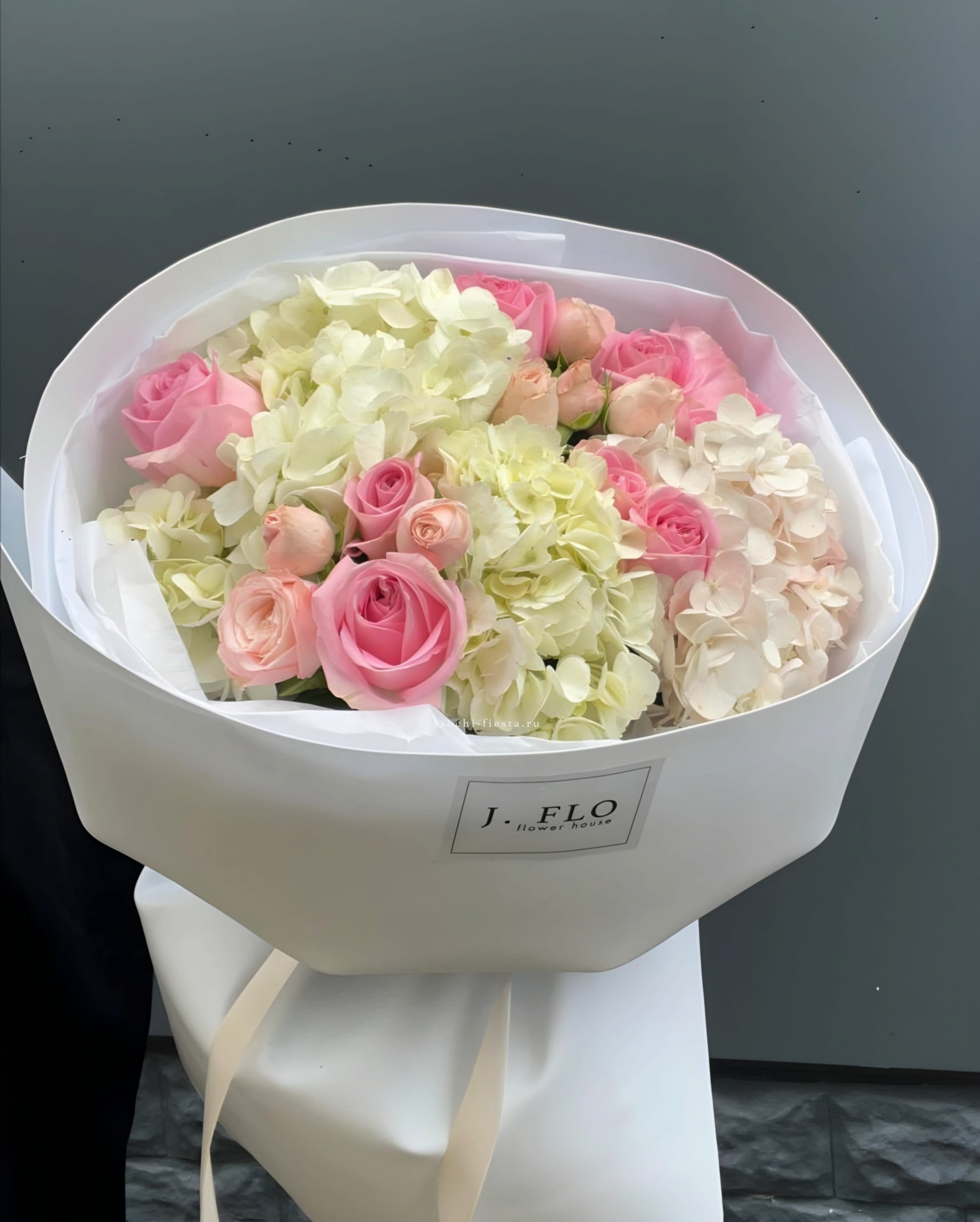 Настоящий цветочный фейерверк в стильной коробке! Эта пышная и многосоставная композиция притягивает взгляды богатством форм и оттенков — от кремового и персикового до насыщенного розового и белого. Это не просто цветы, а целая история о радости, празднике и восхищении. Подарок, который гарантированно произведет яркое впечатление и останется в памяти надолго.