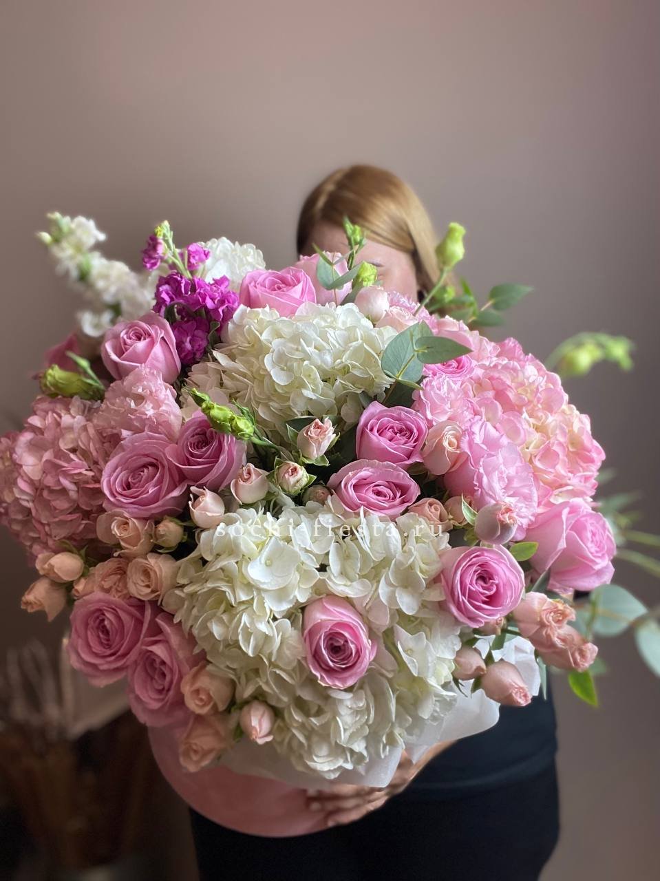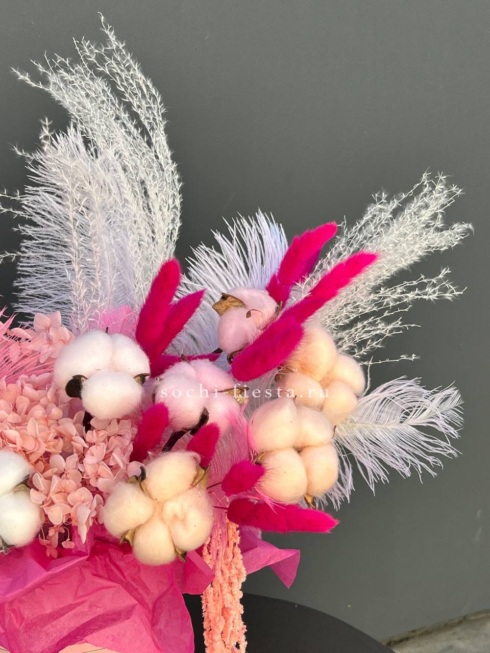 гортензия, хлопок, бомбастик, белая роза, маттиола- может меняться от сезона на диантус, ковыль, упаковка.