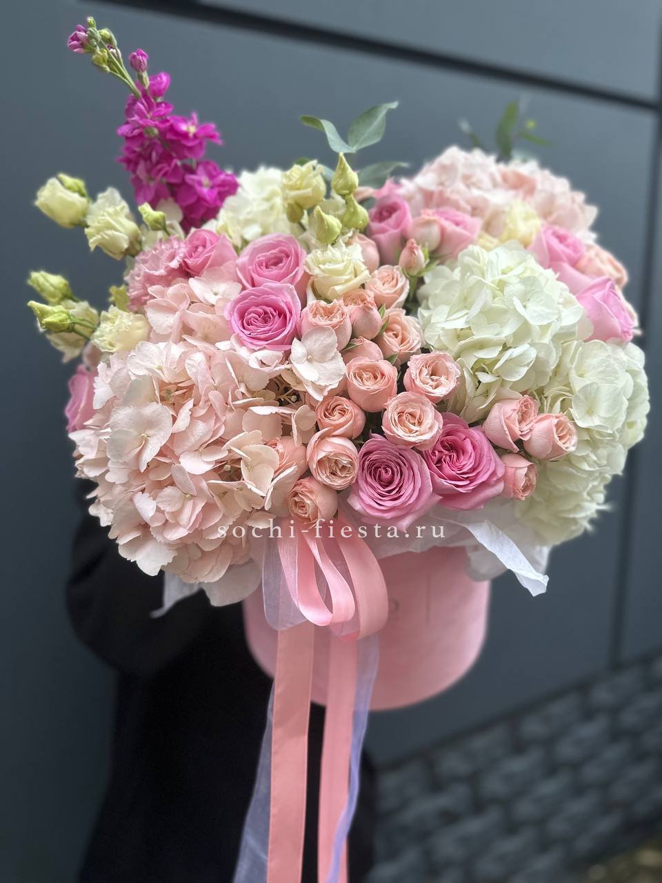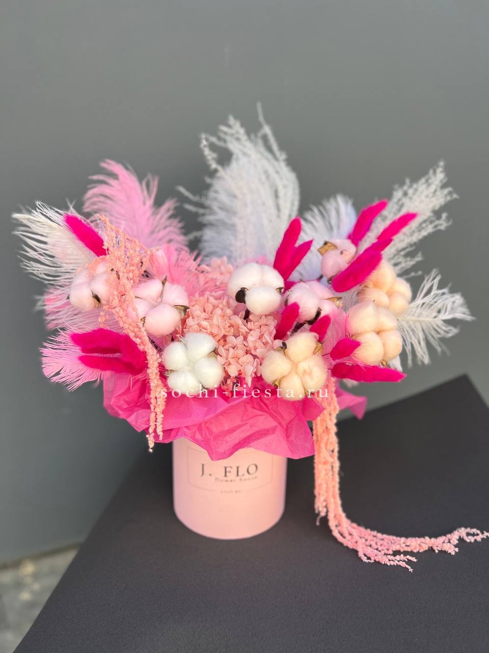 Воздушная гортензия и белые розы складываются в спокойную композицию с мягкими переходами. Хлопок и ковыль добавляют объема, а маттиола наполняет букет легким ароматом. Светлая гамма создает ощущение простора и свежести.