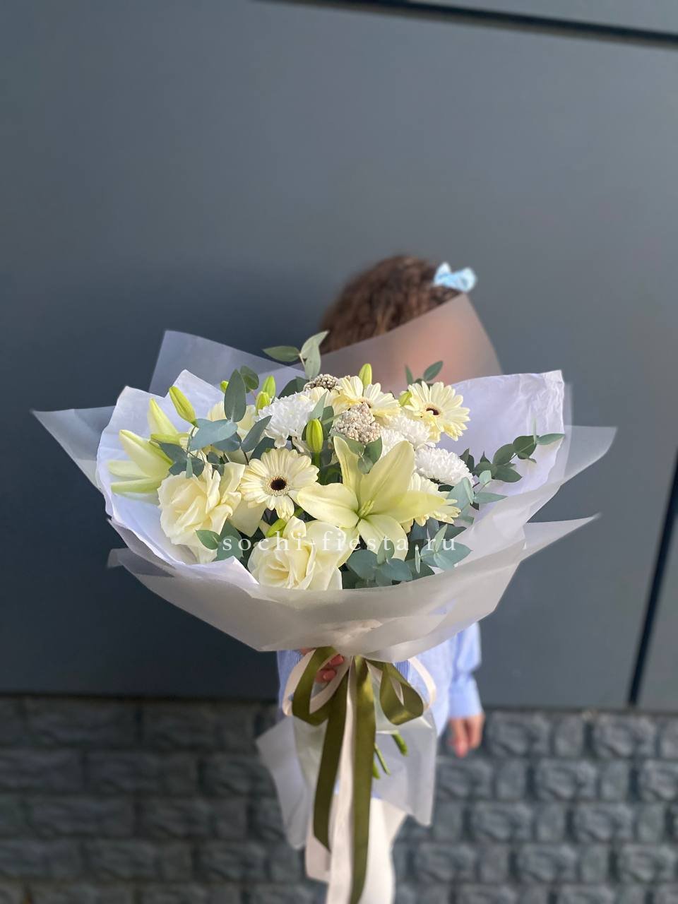 Яркие герберы и белоснежные лилии создают жизнерадостную композицию с чистым силуэтом. Озотамнус добавляет воздушности, а розы завершают образ свежестью и лёгкостью.