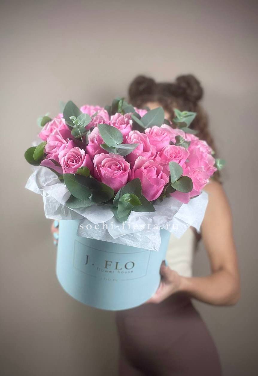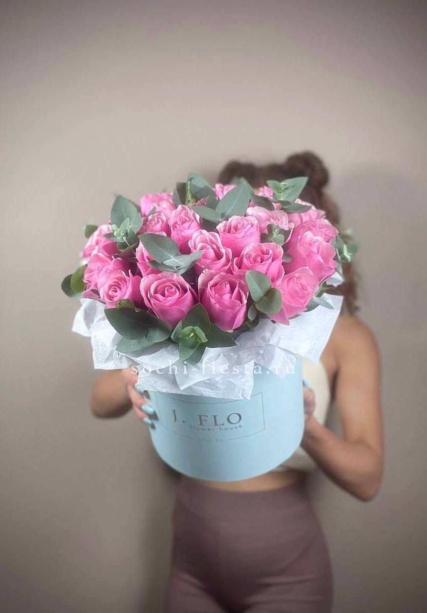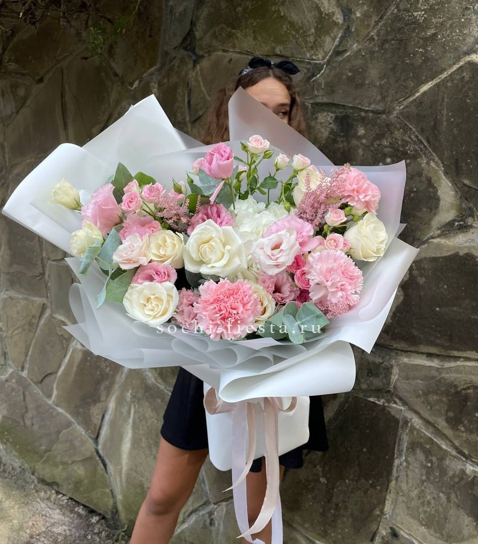 Розовая гамма раскрывается через махровые пионовидные бутоны и классические розы с плотной текстурой лепестков. Эвкалипт вплетается в композицию, создавая свежий акцент.