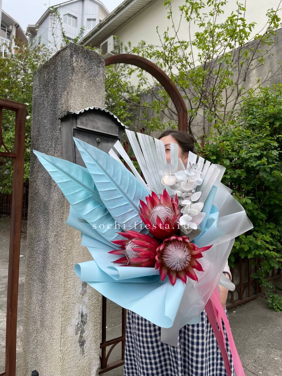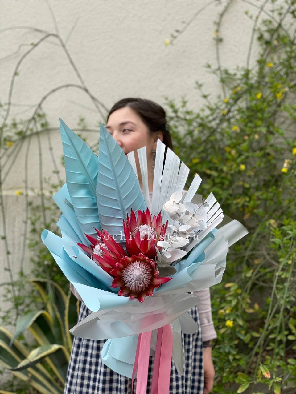 протея 3 шт., декоративная зелень в зависимости от сезона, дизайнерская упаковка.