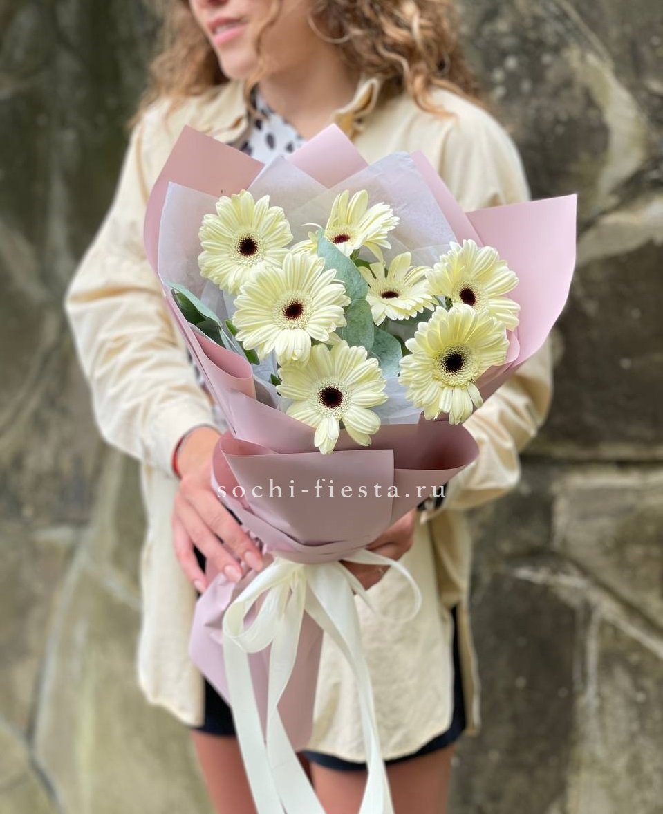 Семь крупных бутонов с открытой сердцевиной и упругими лепестками. Герберы из Голландии держат форму и радуют свежестью. Оттенок согласуется с вами перед сборкой.