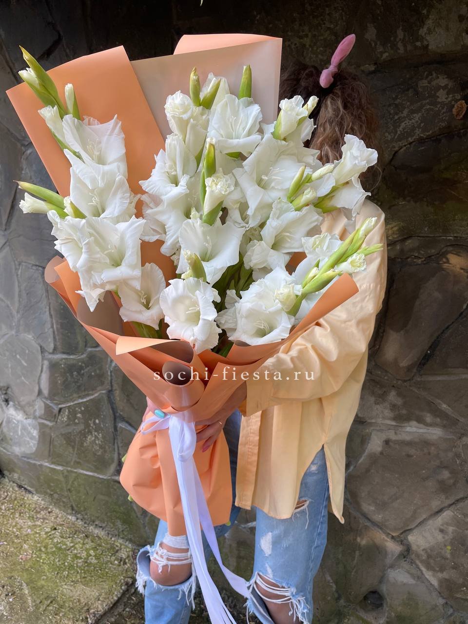 белые гладиолусы - 9 шт., лента, корейская пленка.