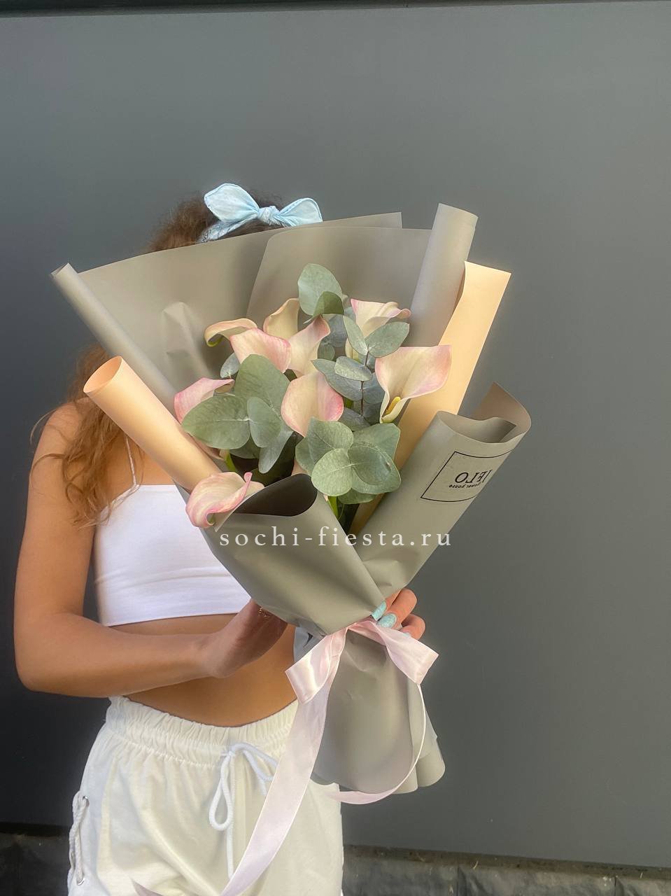 Девять калл собраны в плотную вертикальную композицию с графичными линиями стеблей и строгими соцветиями. Декоративная зелень добавляет объём, сохраняя лаконичность формы. Букет для тех, кто ценит выразительность без лишних деталей.