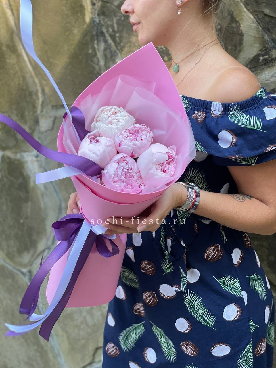 Пионы Сара Бернар в мягкой упаковке из тишью и фоамирана. Бутоны разной степени раскрытия создают живую динамику и объём композиции.