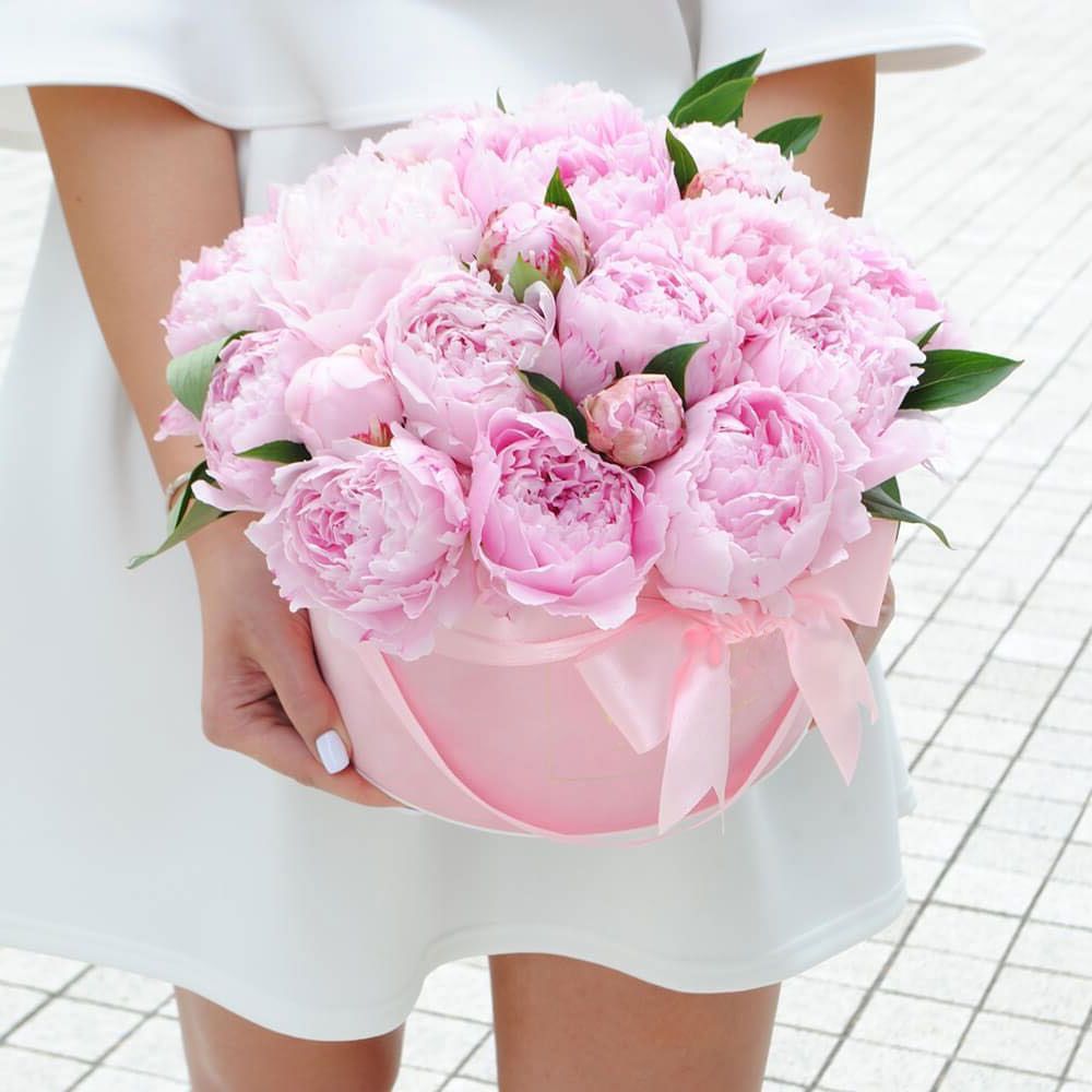 21 пион нежных оттенков, светлый цилиндр D20, дизайнерская пленка или фетр.