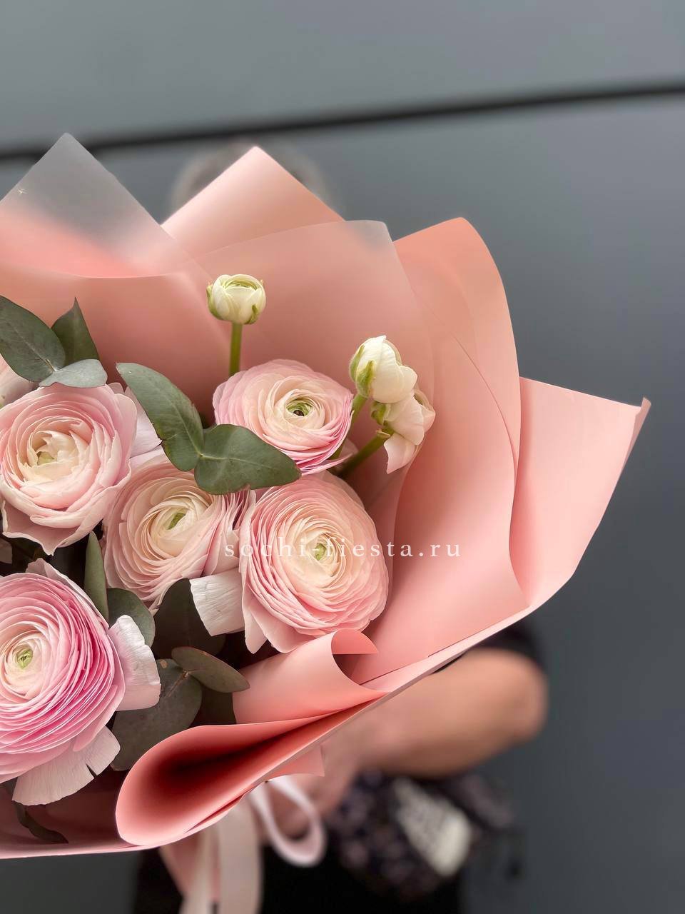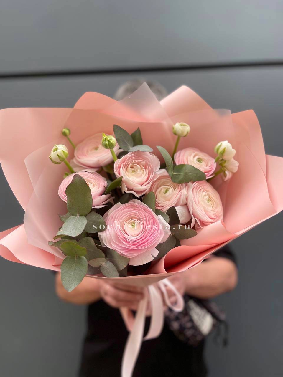 Для заказа товара "Ранункулюсы с эвкалиптом" с доставкой в Новороссийске нажмите в корзину