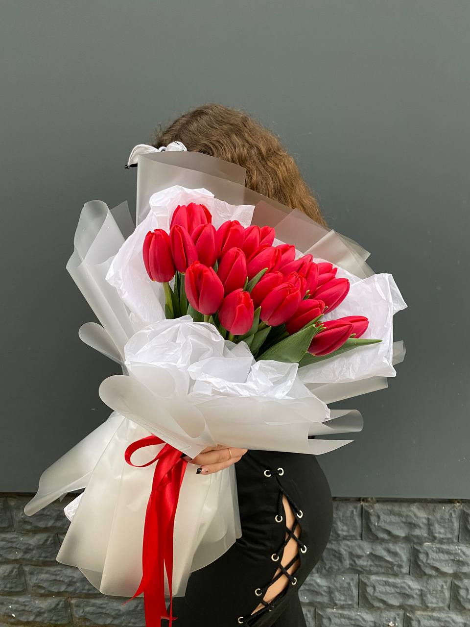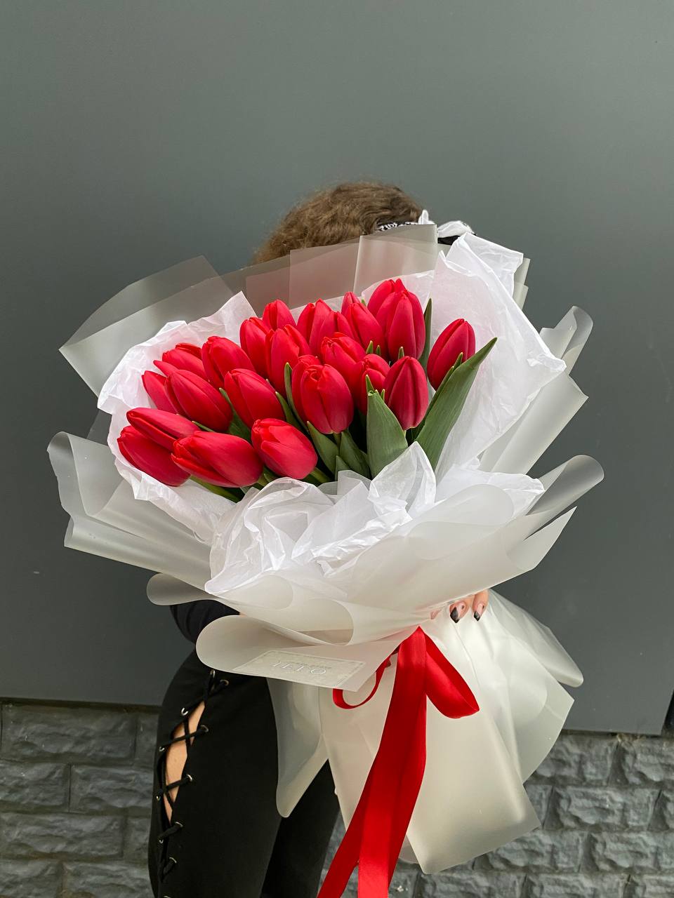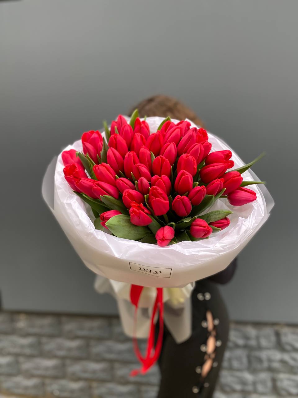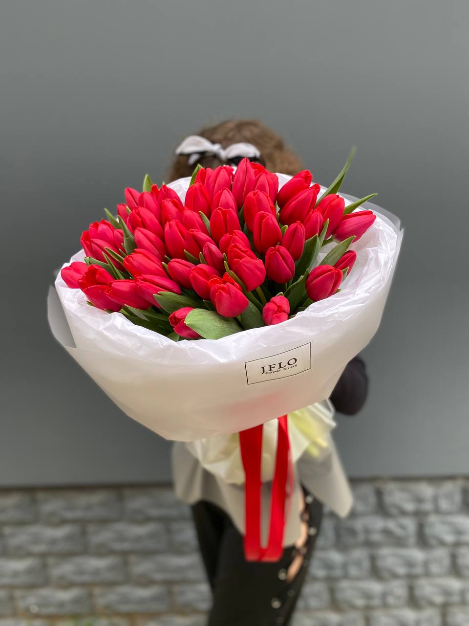 Сто один бутон в бело-розовой гамме выстраивается в объёмную композицию с плотным силуэтом. Каждый тюльпан держит свою линию, создавая ритмичную структуру букета.