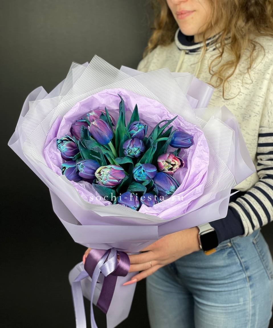 15 тюльпанов, лента, тишью, комбинированное оформление.