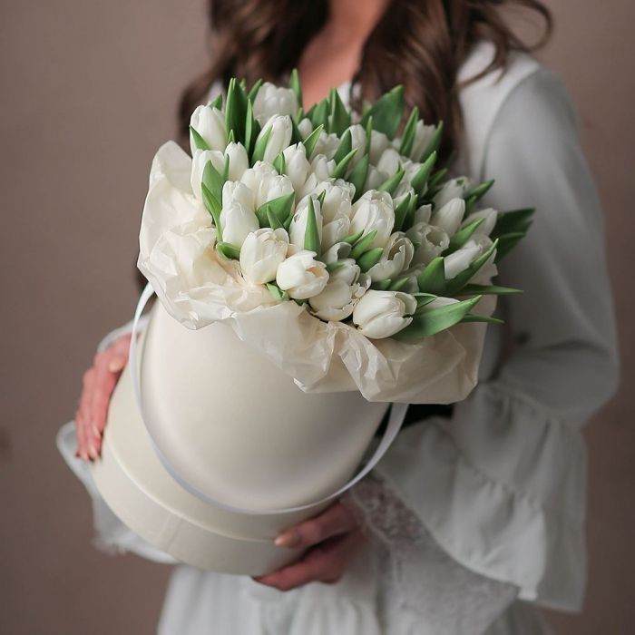 Тридцать девять белых тюльпанов выглядят свежо и лаконично в просторном цилиндре. Композиция держит форму и радует глаз несколько дней, сохраняя первозданную свежесть бутонов.