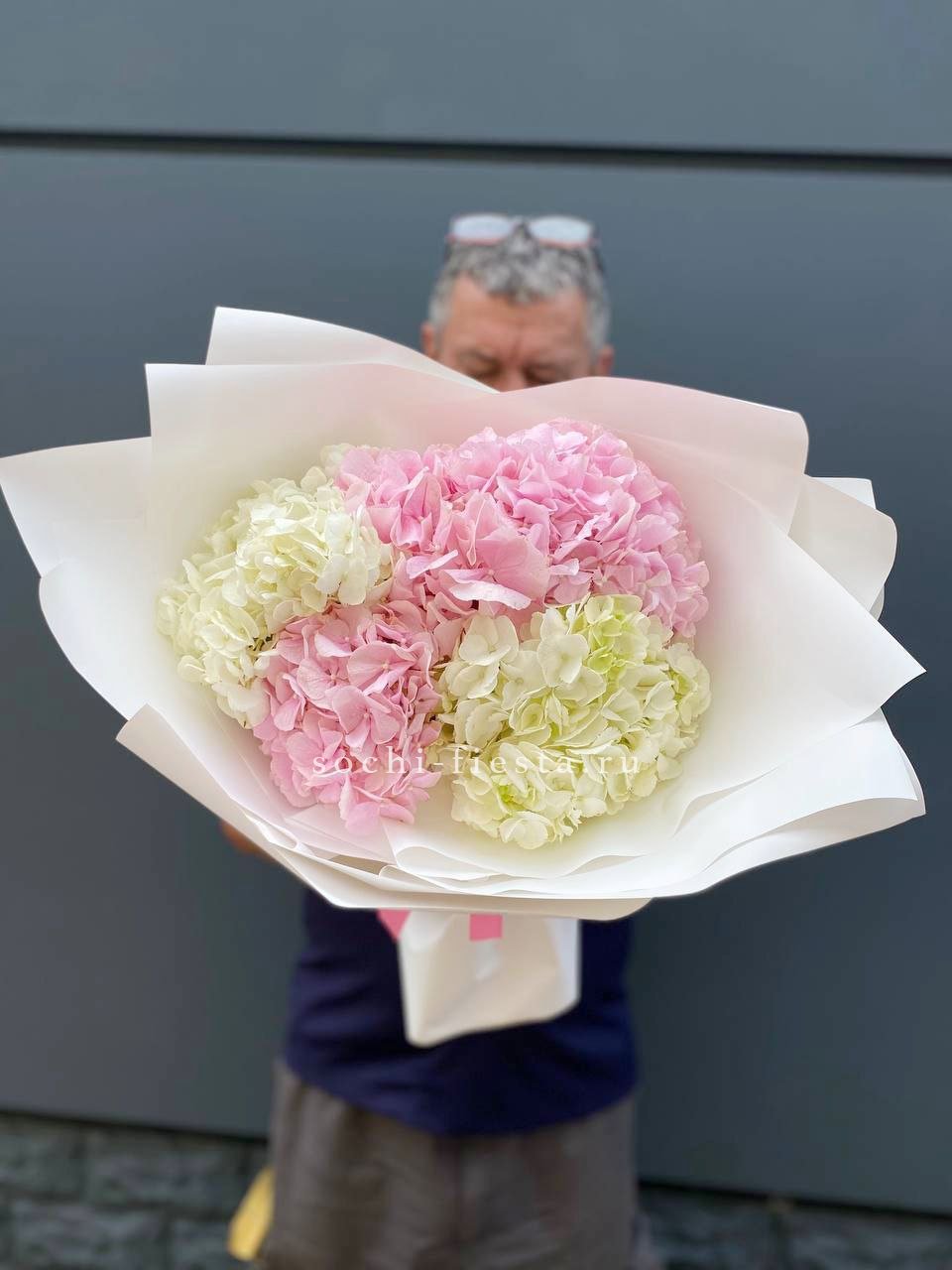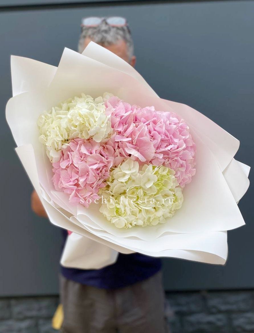 гортензия, розы одноголовые, кустовые розы, вероника (аналог вне сезона), маттиола (аналог вне сезона), эвкалипт, лента, дизайнерская упаковка.