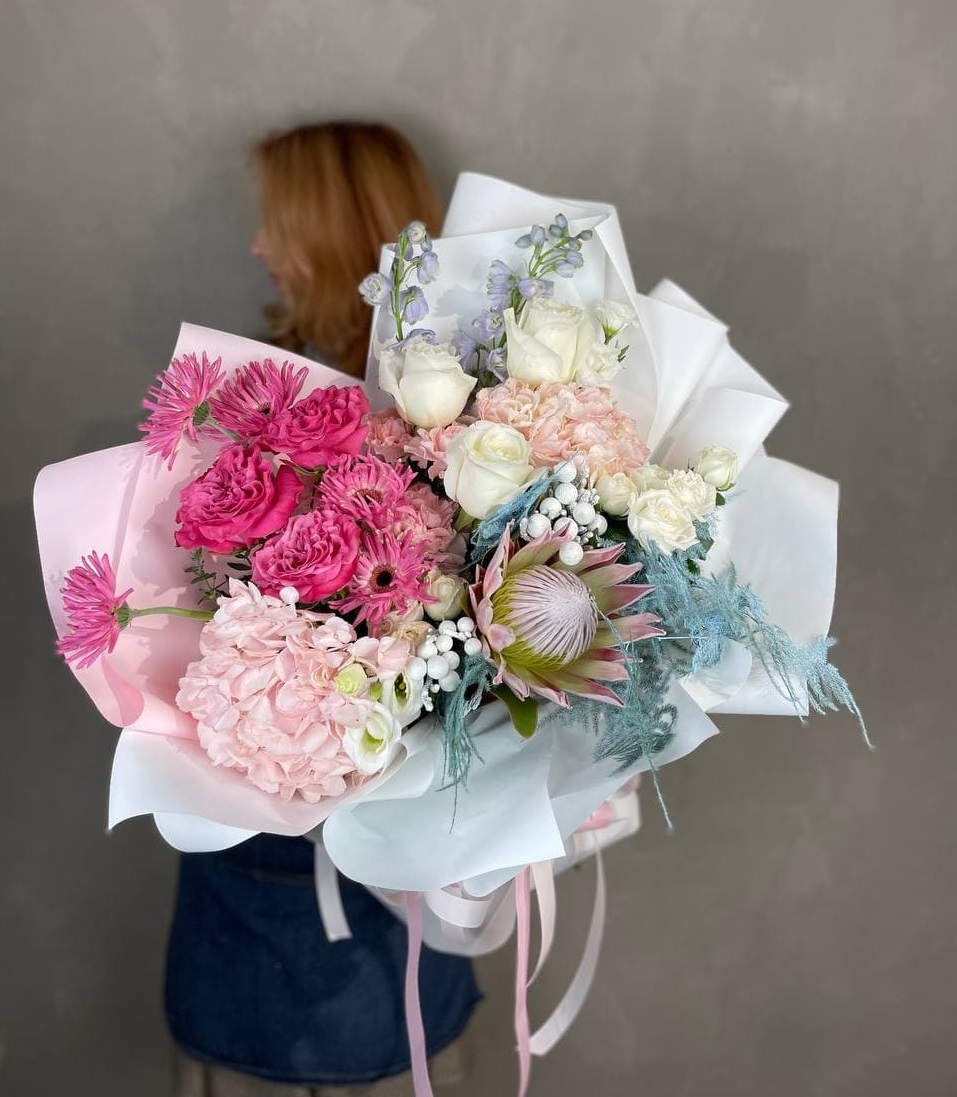 Протея задаёт графику, гортензия заполняет объём, а кустовые розы рассыпаются между крупными соцветиями. Аспарагус создаёт воздушную раму, бруния добавляет текстурные точки. Букет с продуманной архитектурой и смелым растительным миксом.