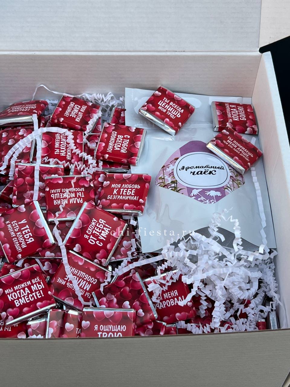 Сто одна плитка шоколада и чай в одном наборе превращают простую идею в визуальное высказывание. Повод написан цифрой, а эмоция считывается с первого взгляда.