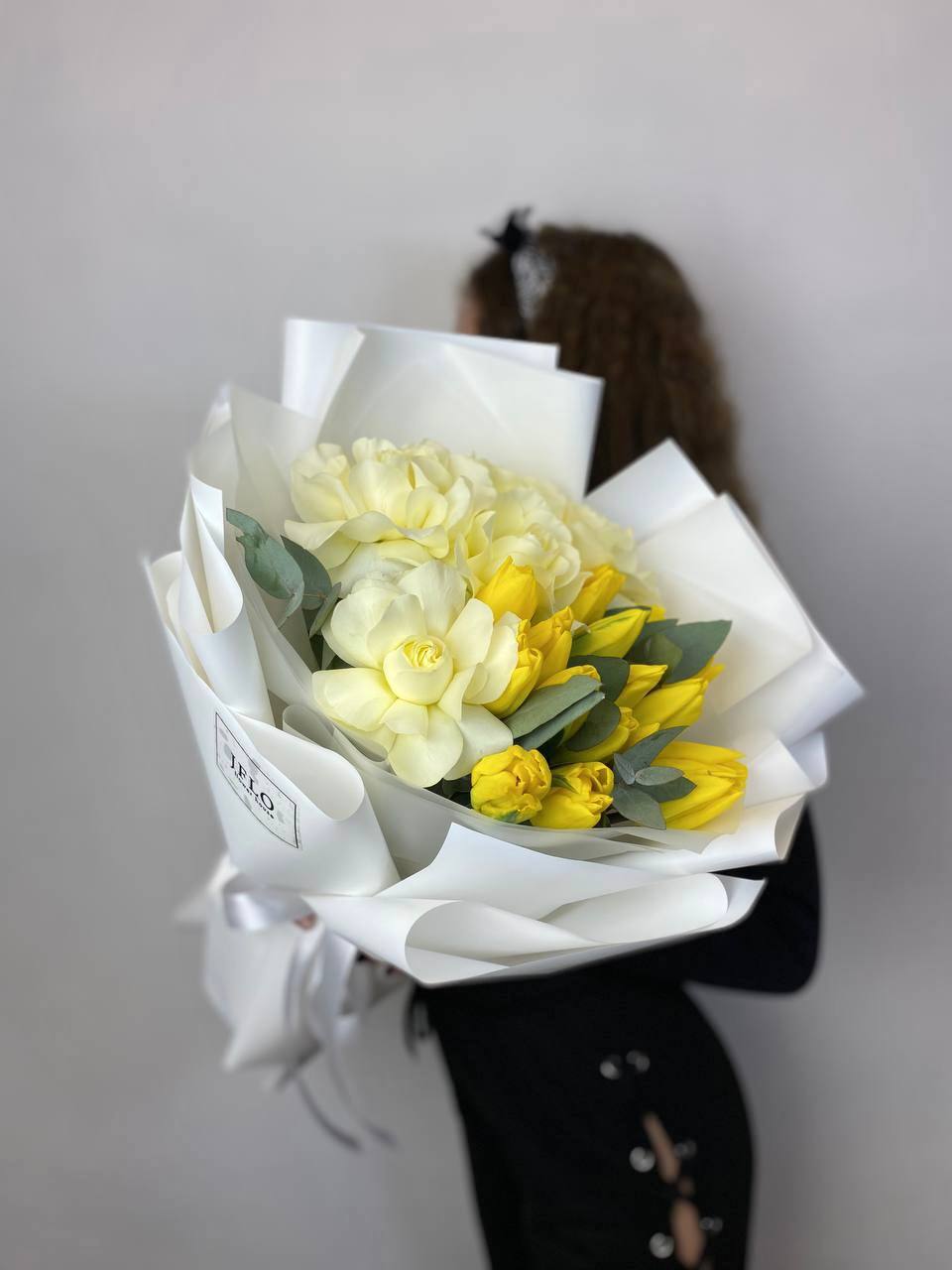 Солнечные тюльпаны переплетаются с розами в тёплой жёлтой гамме. Эвкалипт добавляет свежести и завершает композицию мягкими серебристыми нотами.