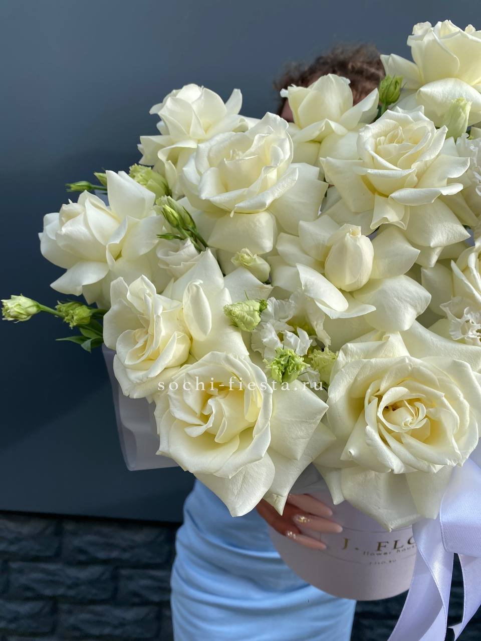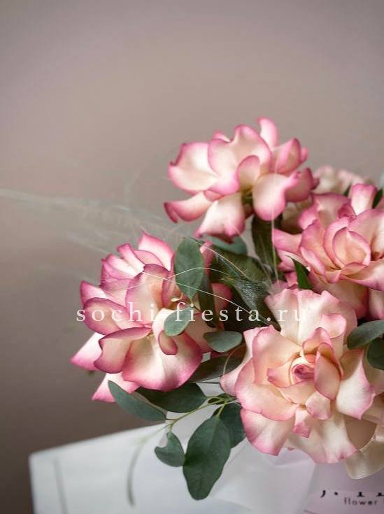 белые розы, эустома, цилиндр D13, эвкалипт, лента, упаковка.