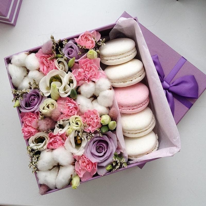 Эустомы и пионовидные розы соседствуют с французскими макарон в коробке в форме сердца. Диантусы и эвкалипт создают объём, а сладкий акцент делает композицию завершённой.