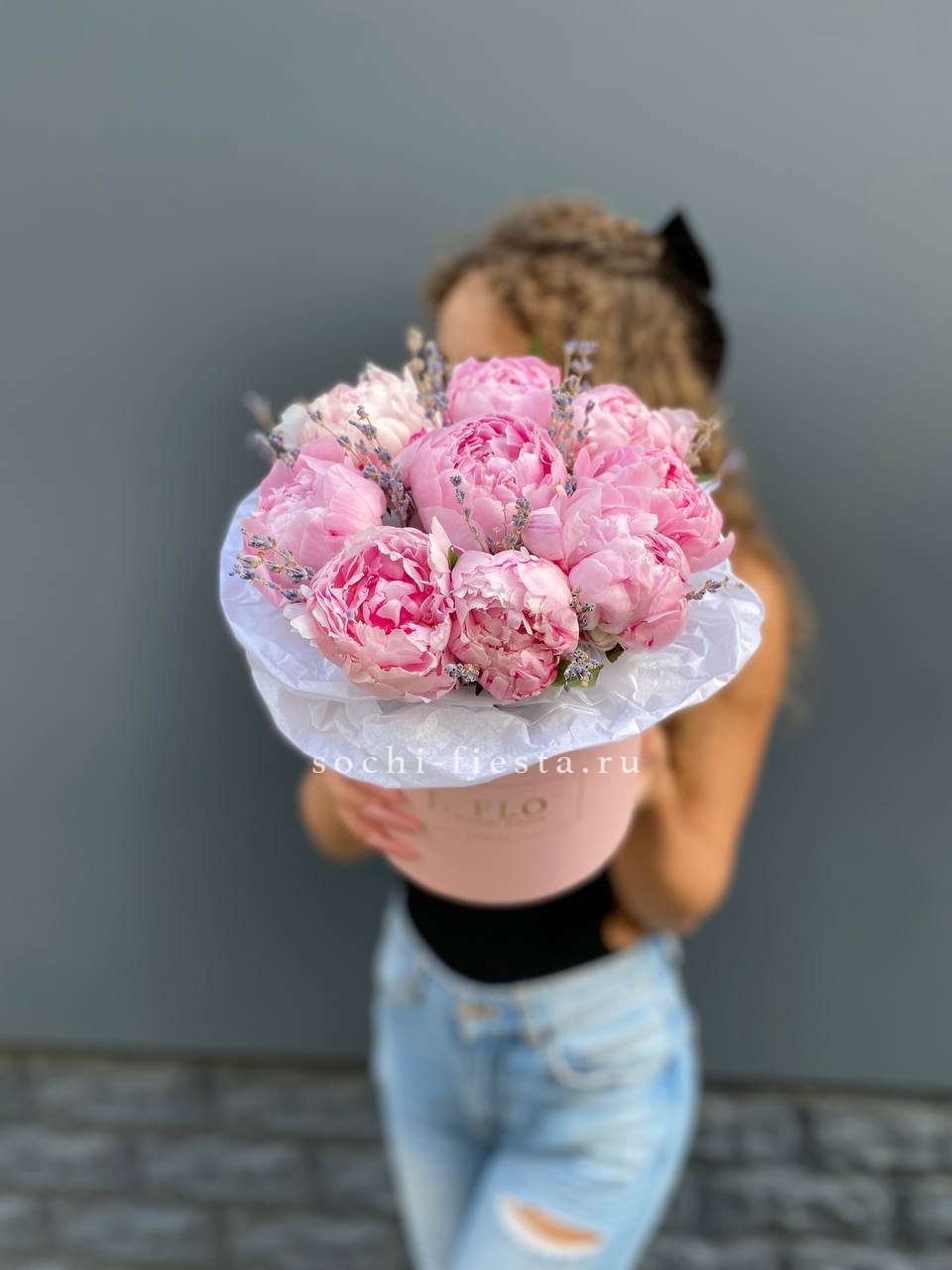 Девять пионов раскрываются над сиреневой дымкой лаванды. Цилиндр формирует вертикальную линию композиции. Фиолетовые оттенки переходят от насыщенных до припыленных.