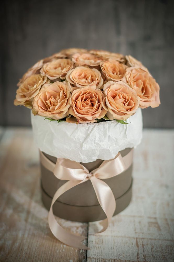 Девятнадцать персиковых роз собраны в темно-бежевом цилиндре с продуманной укладкой. Бутоны плотно прилегают друг к другу и создают объемную композицию с мягким переходом оттенков. Формат бокса сохраняет свежесть и позволяет разместить цветы без дополнительной вазы.