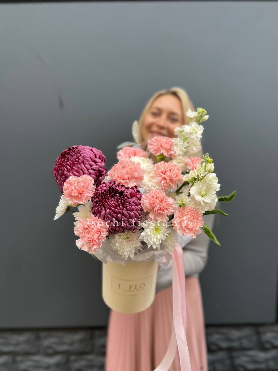 Компактная композиция с яркими одноголовыми хризантемами и душистой маттиолой в круглой коробке. Диантус добавляет графичности, а тишью смягчает линии. Цвет упаковки можно выбрать под настроение.