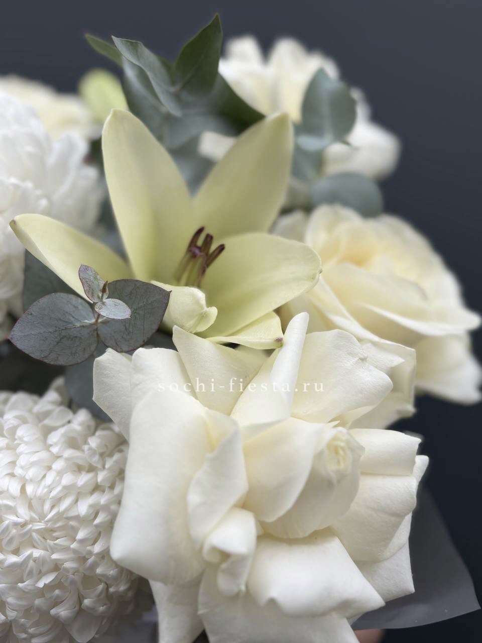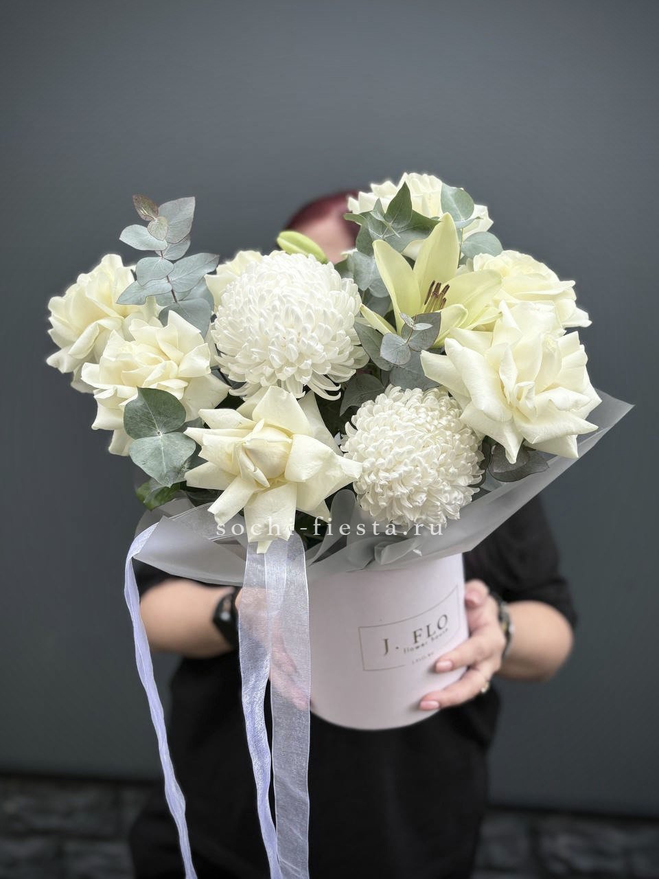 эустома, пионовидная кустовая роза, белая роза, хлопок, эвкалипт, бокс 13.