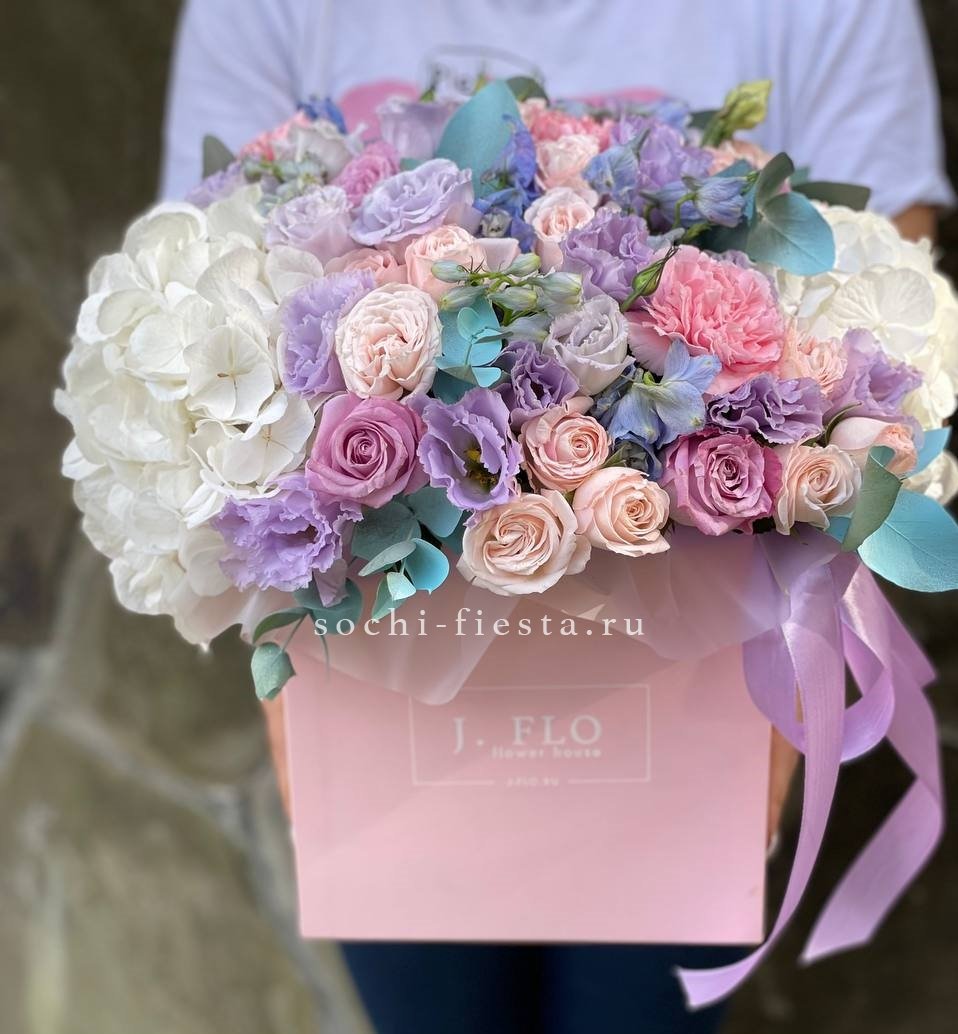 Воздушная композиция в пастельной гамме с акцентом на фактуру раскрытых бутонов. Пионовидные розы и эустома создают объёмный силуэт, а хлопок добавляет графичности.