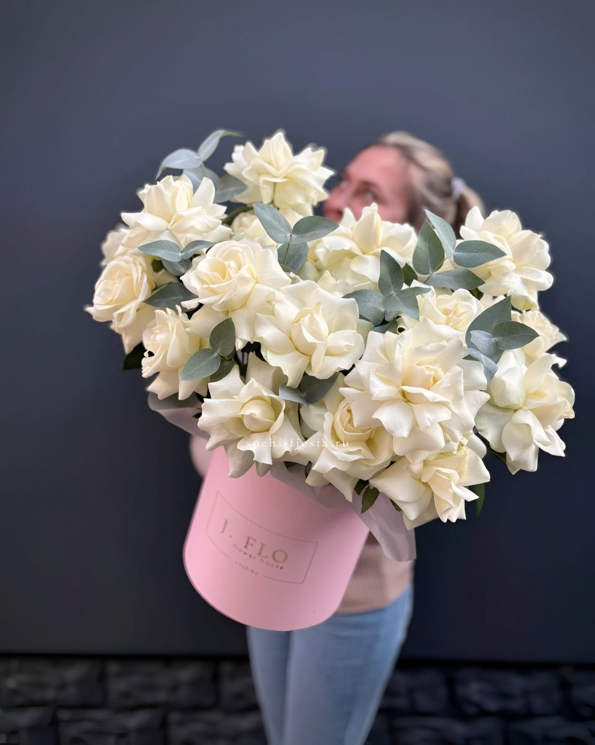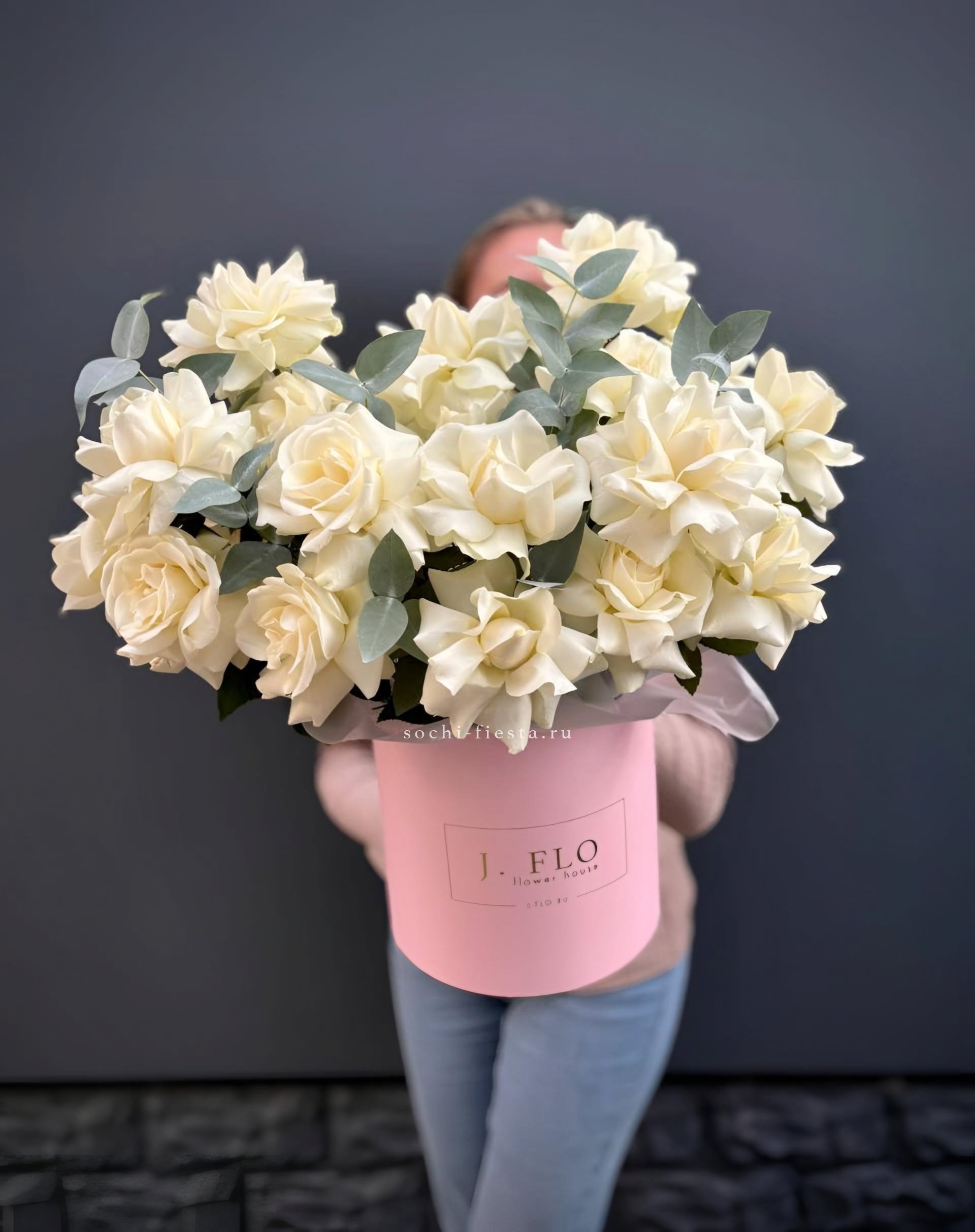 Пятнадцать роз Мандала в боксе образуют плотную шапку с густыми многослойными бутонами. Нобилис добавляет фактурную глубину и завершает композицию.