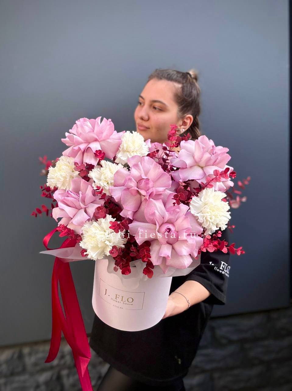 Французские розы цвета утренней зари дополнены воздушными соцветиями диантуса. Эвкалипт добавляет серебристые ноты и завершает округлую форму бокса.