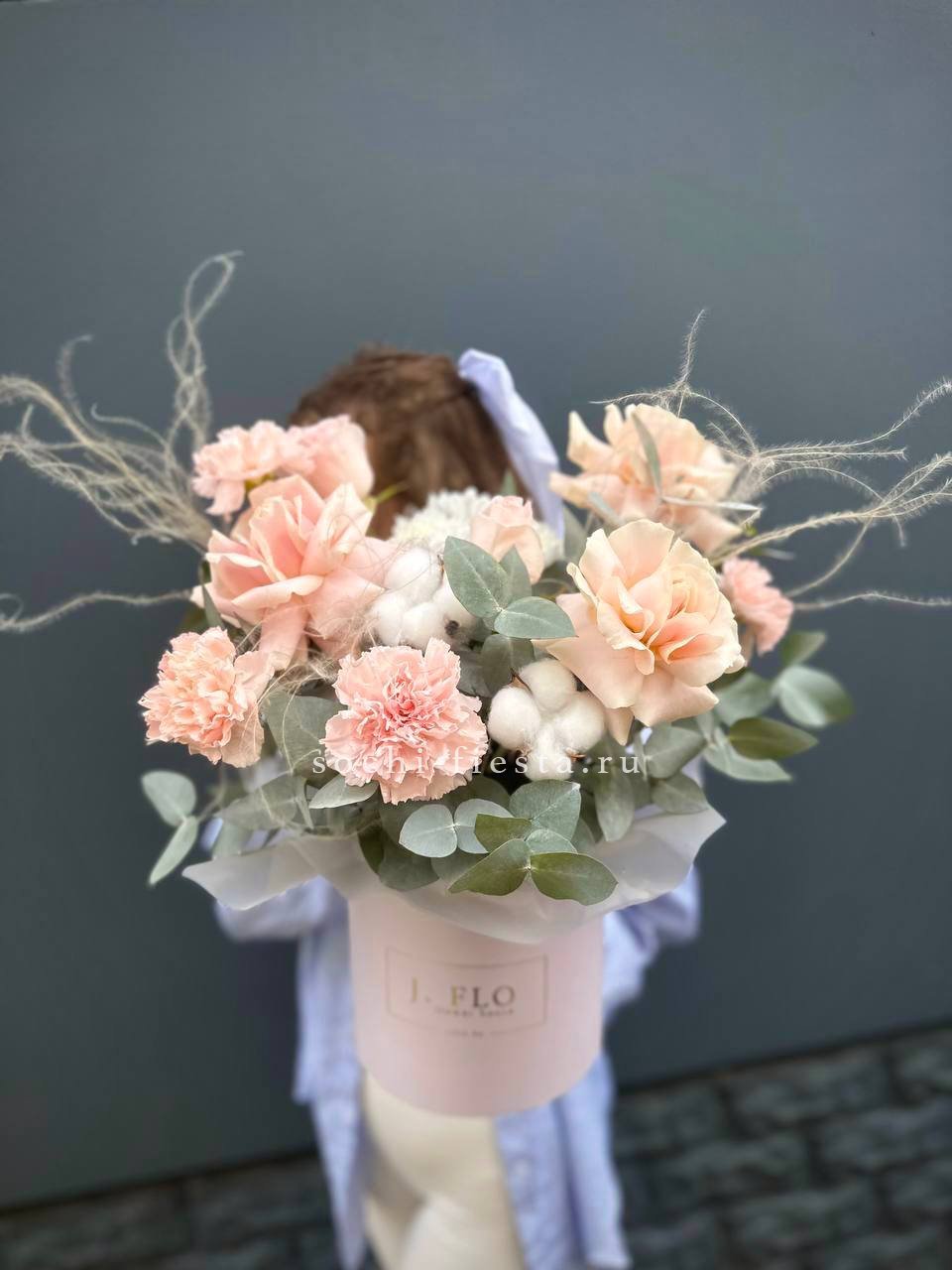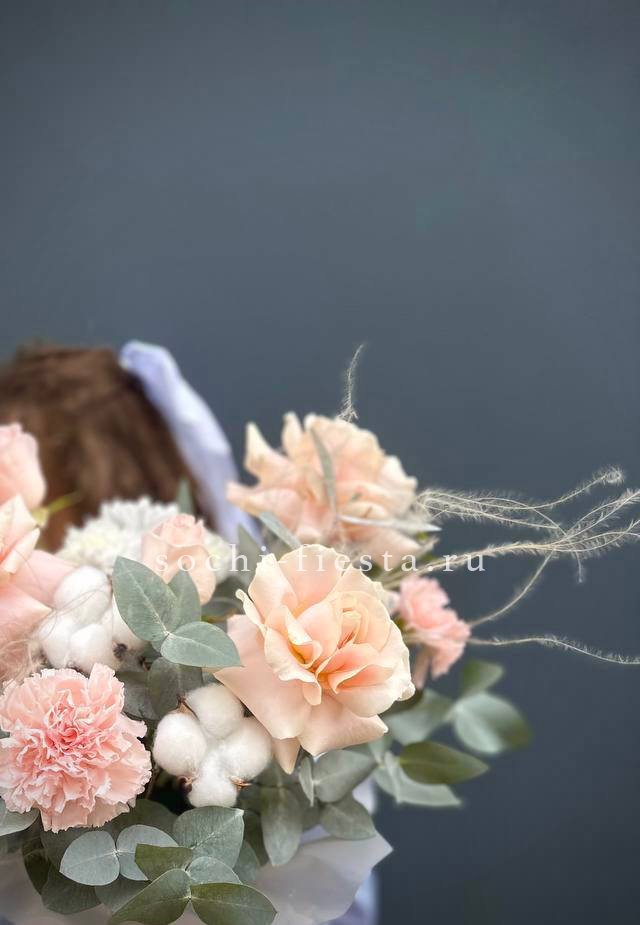 Гортензия и пионовидные розы создают плотную текстуру с мягкими переходами между крупными соцветиями. Озотамнус добавляет воздушности, а сезонный цветок вносит свежий акцент в общую композицию.