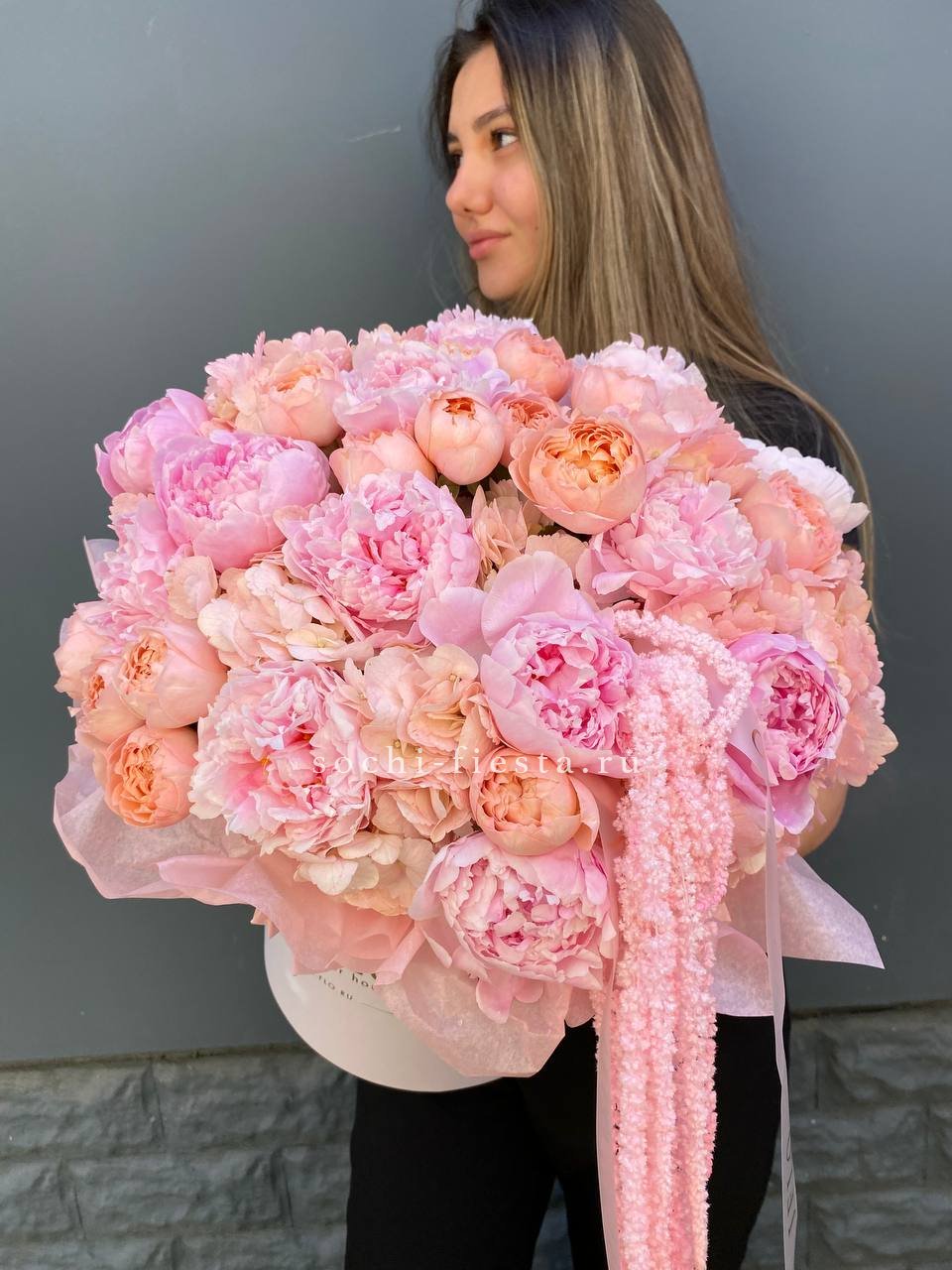 Пионы и кустовые розы собраны плотно, почти без воздуха между бутонами. Гортензия добавляет объём, амарант выстраивает вертикальные линии. Композиция держит форму и не рассыпается.