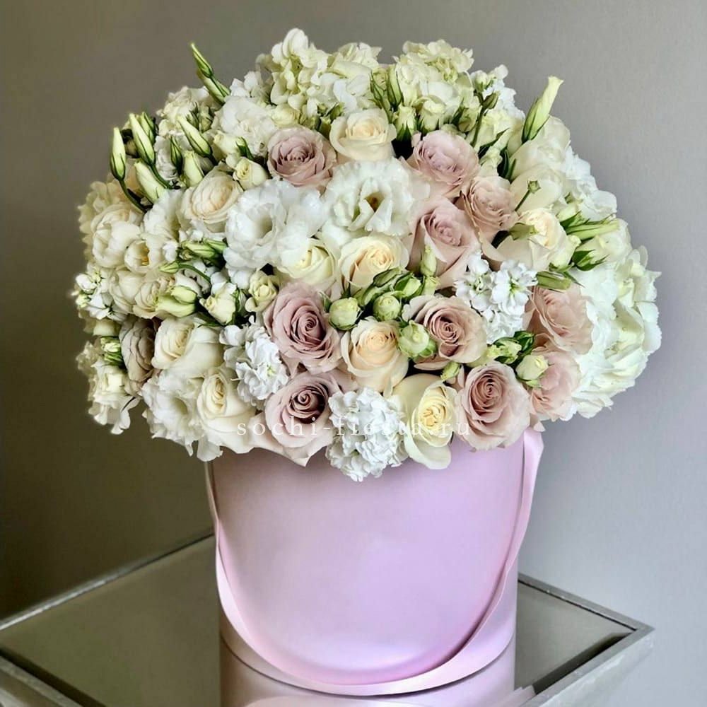 Воздушная композиция в бархатной коробке раскрывается пышными соцветиями гортензии и многолепестковыми бутонами эустомы. Розы двух оттенков создают мягкий переход от белоснежного к пудровому. Флористическая пена сохраняет свежесть каждого цветка надолго.