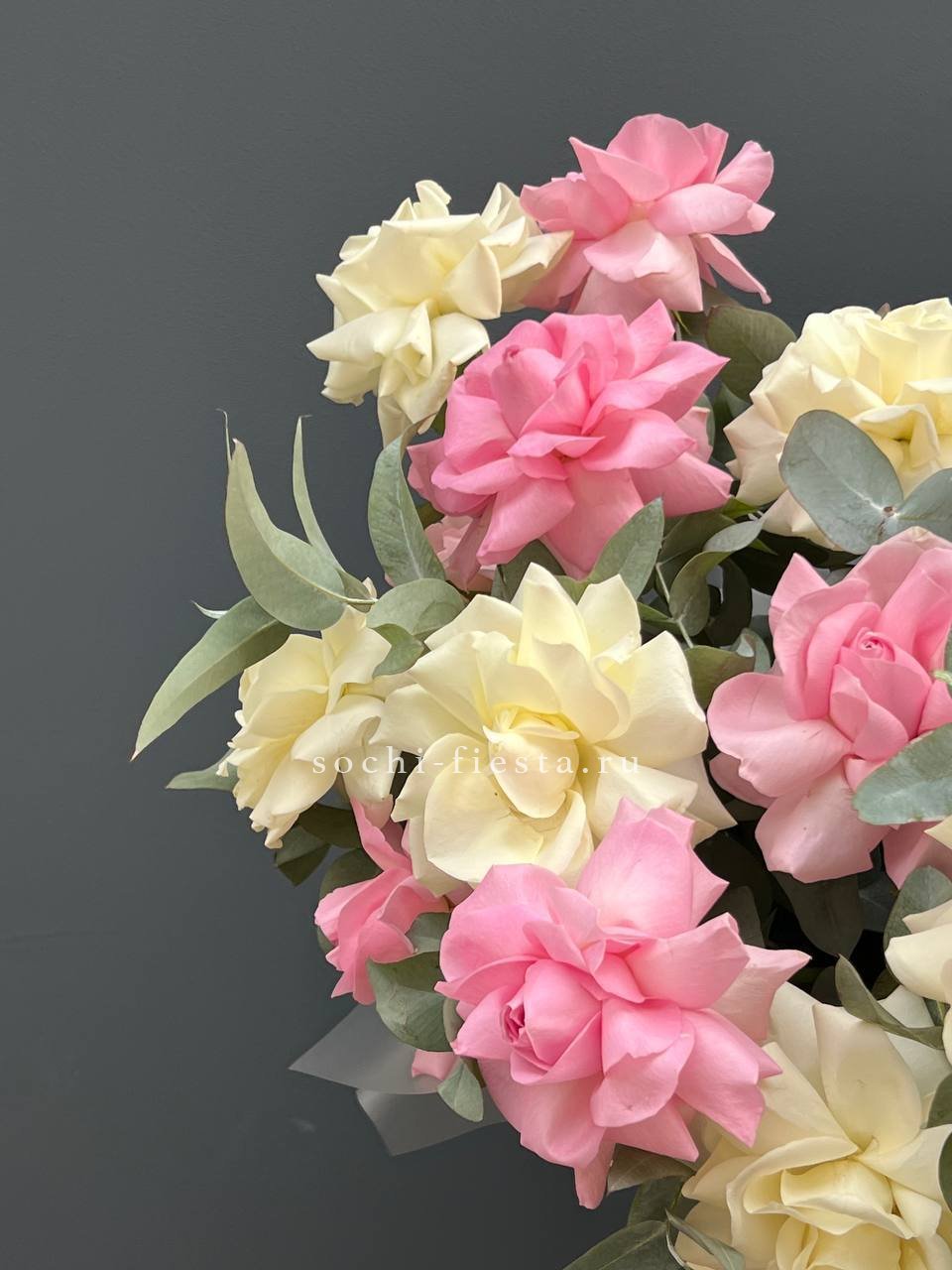 Семнадцать французских роз в пастельном миксе собраны в круглую форму. Композиция компактна и выразительна благодаря сочной зелени эвкалипта.