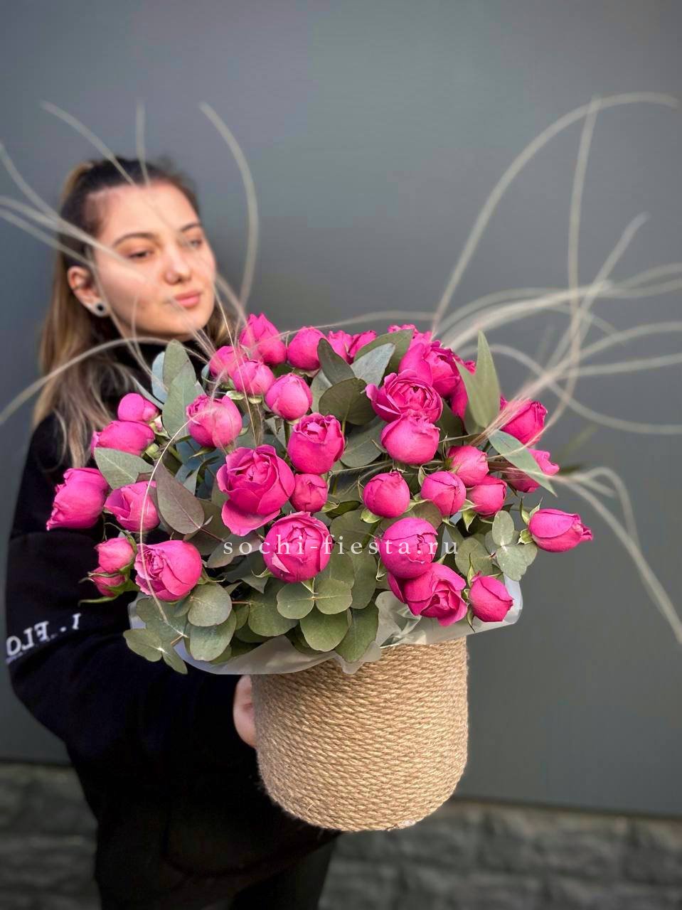 розы и гацинты в джутовом кашпо.
