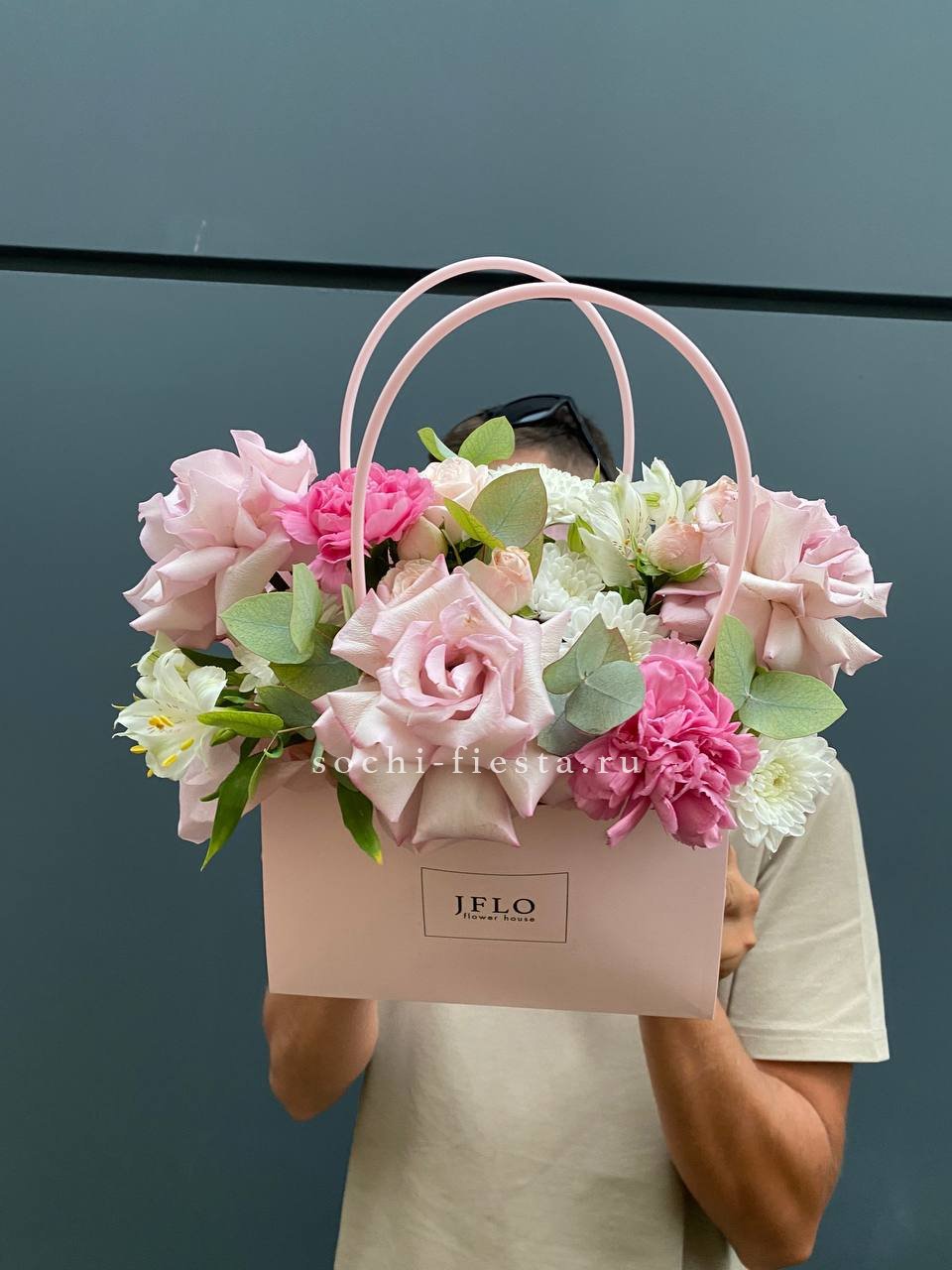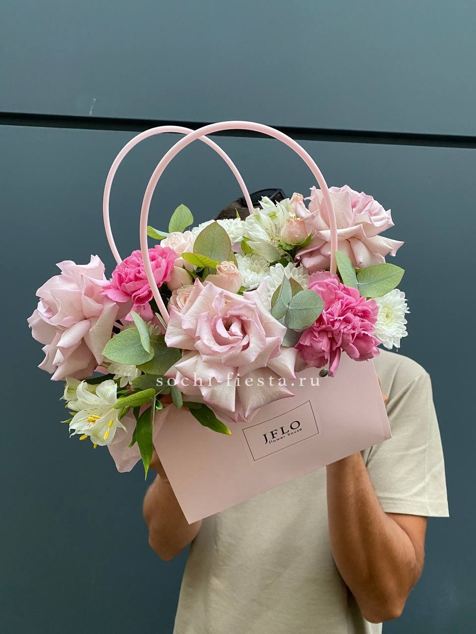 гербера, диантусы, бомбастики, альстромерии, лента, сумка-кашпо.