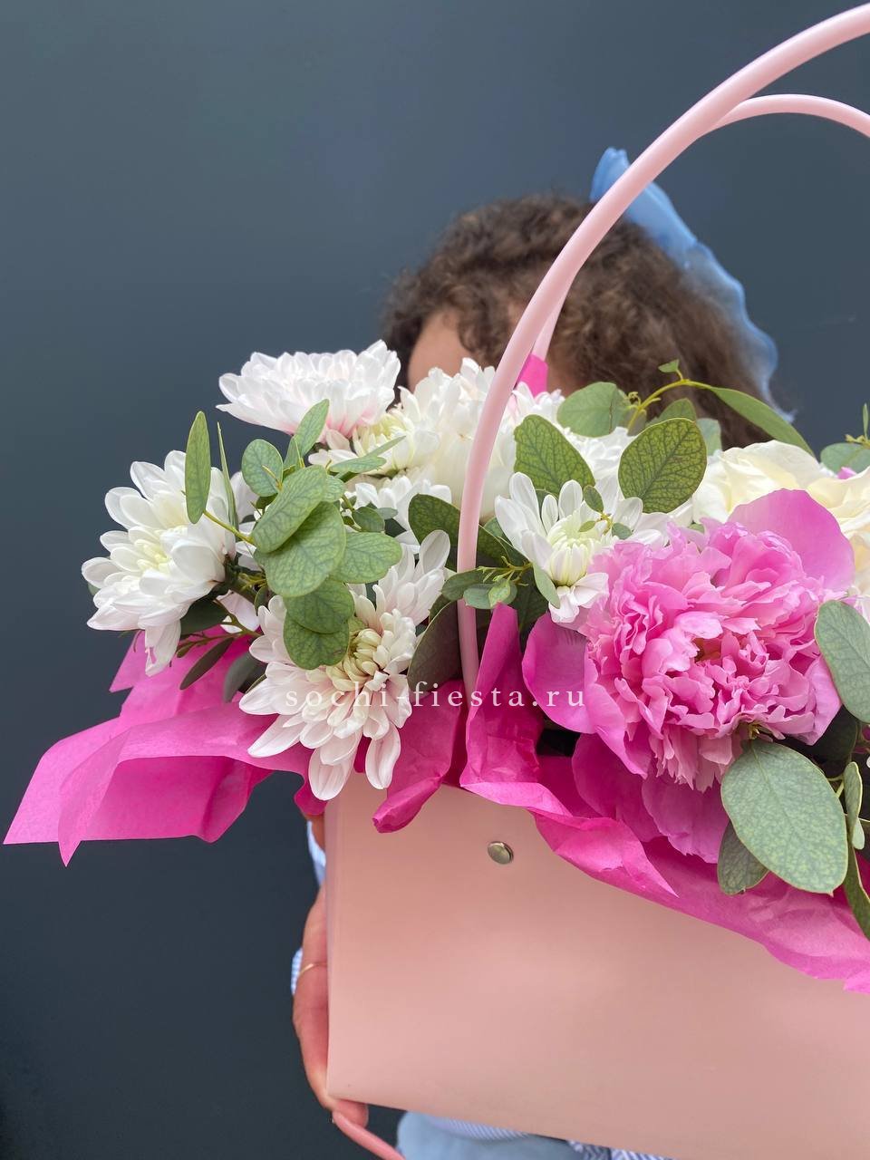 хризантемы, пионы, лента, сумка-кашпо.