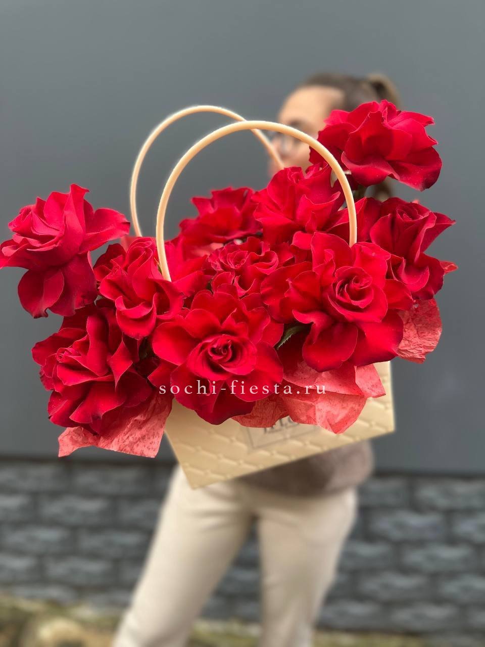 гортензия, розовые розы, эустома, диантусы,эвкалипт, лента, сумка-кашпо.