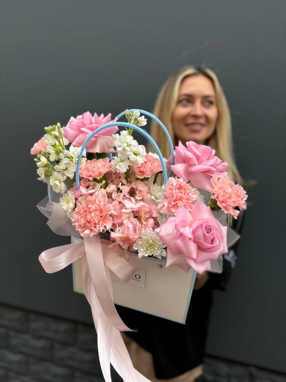 Голубая гортензия задает тон всей композиции, а яркие герберы и диантусы добавляют живости. Компактная форма в сумочке удобна для вручения и не требует вазы.