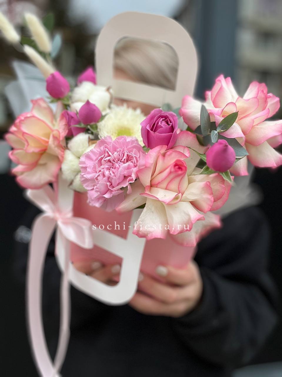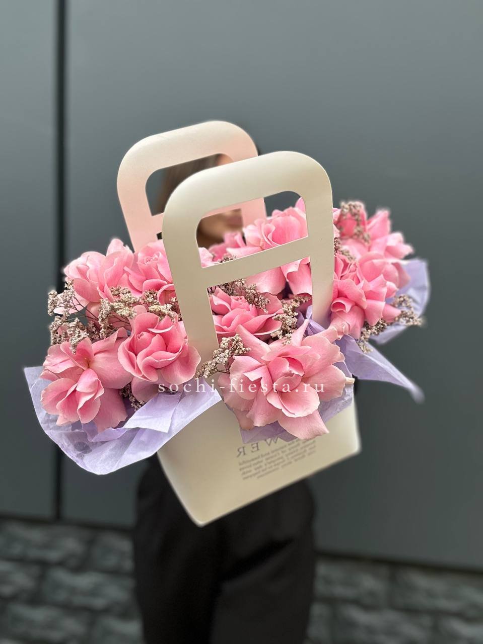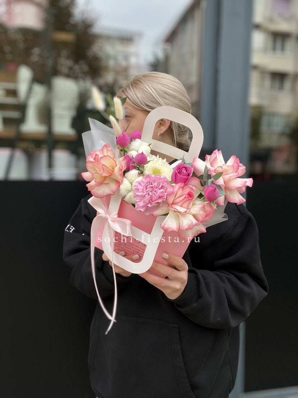 Компактная сумочка в двух оттенках объединяет цветы с мягкими переходами тонов. Форма держится плотно и естественно.