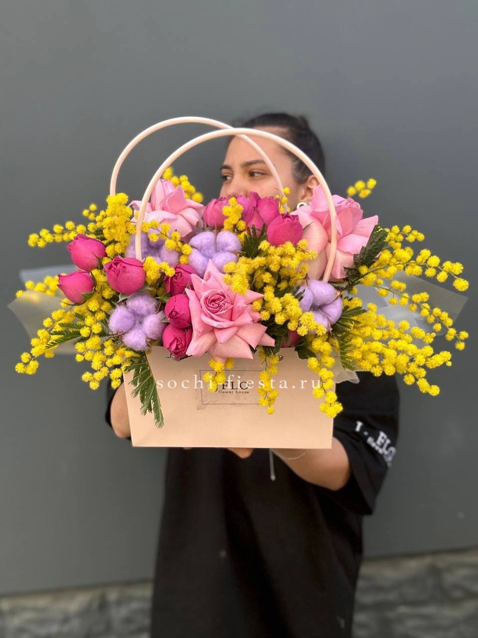 Розовые оттенки переплетаются с солнечными пушистыми шариками мимозы и белоснежным хлопком. Весенняя композиция в удобной сумочке дарит ощущение первых теплых дней и пробуждения природы.