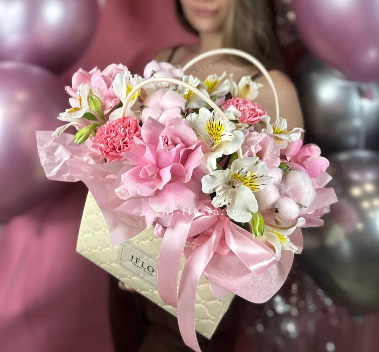 сумочка, хризантема, розовые розы, диантус, эвкалипт.