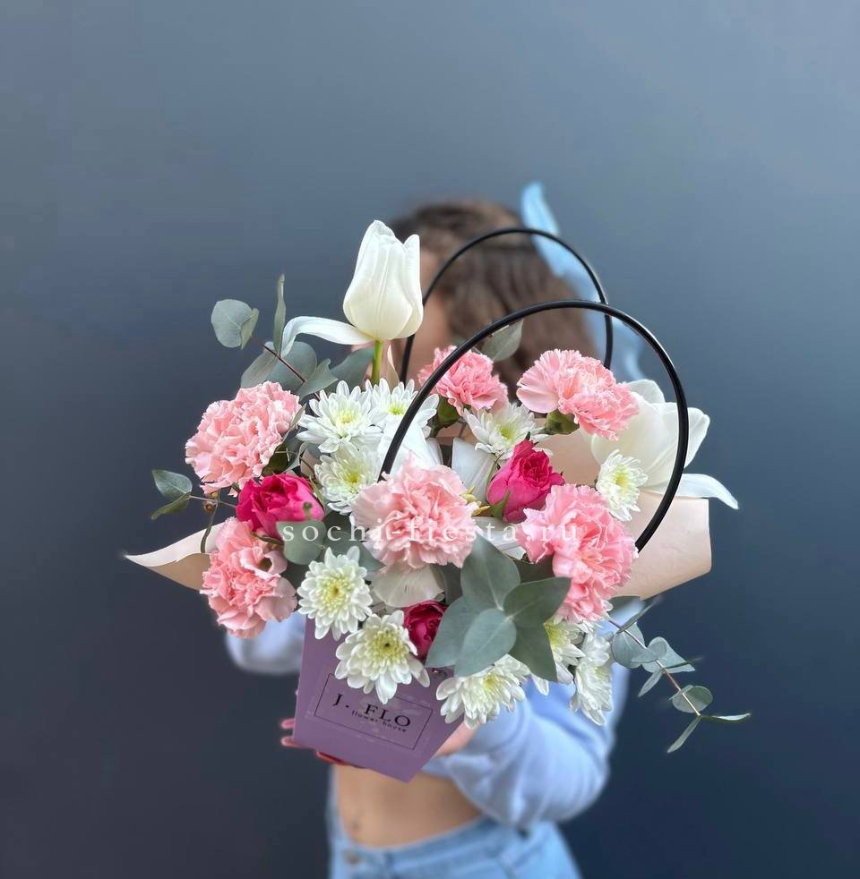 Данная цена доступна при единовременном заказе от 10 шт. Состав: хризантема кустовая, эвкалипт, дантус, сумочка.