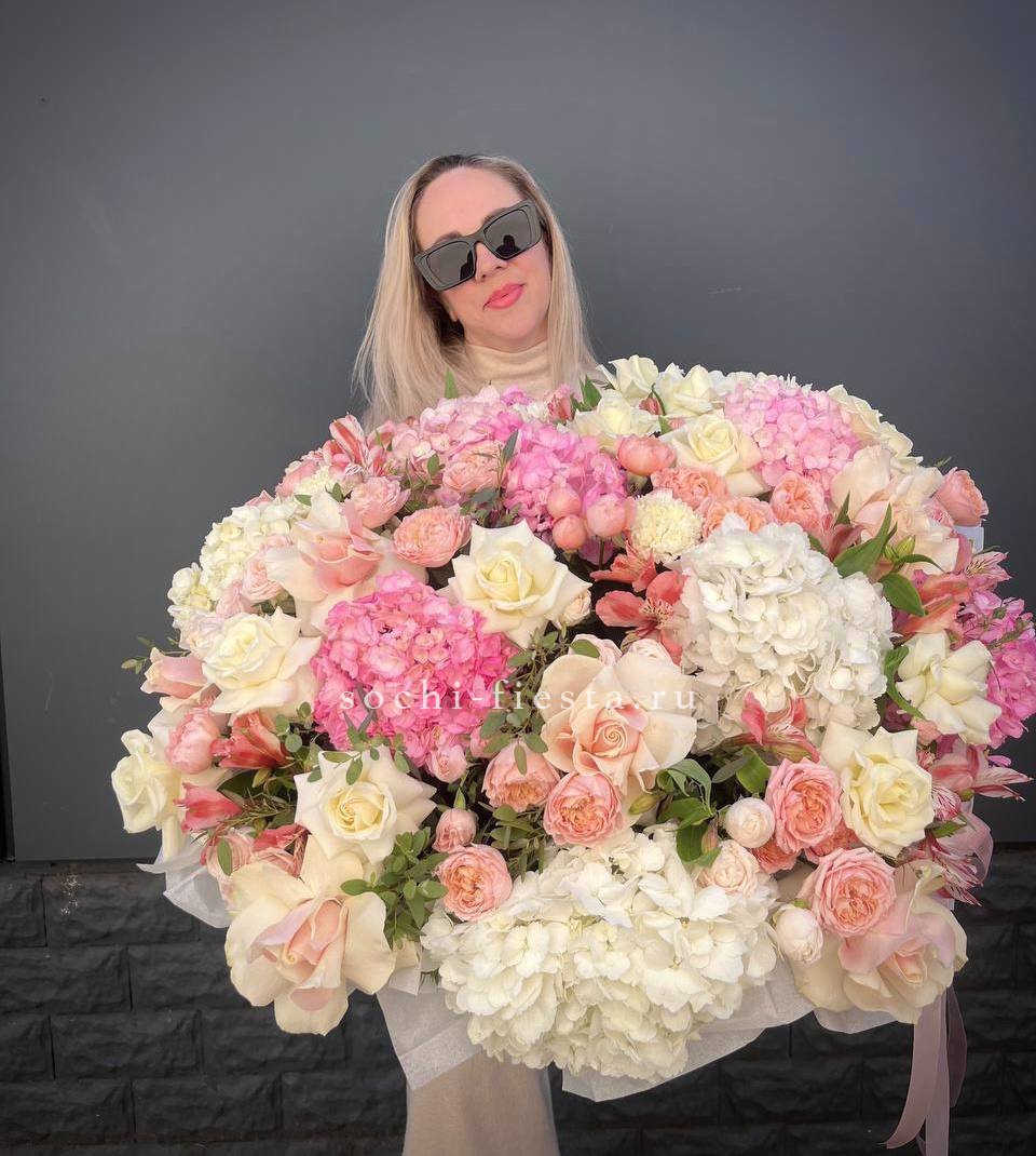 Пышная корзина объединяет пионовидные розы с воздушной гортензией и многослойной эустомой. Матиолла и лимониум добавляют глубину композиции, а диантус создает мягкие переходы между крупными бутонами.