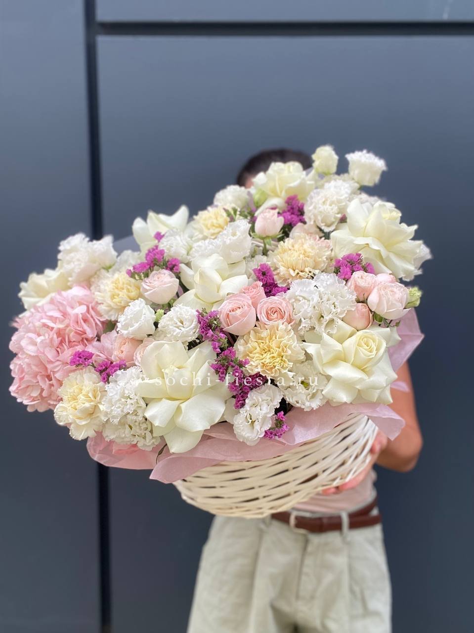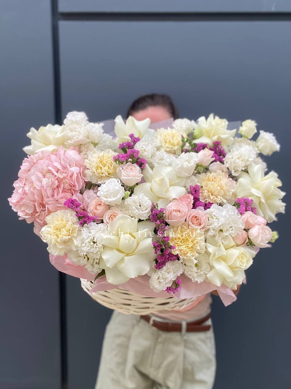 Гортензия и эустома задают объём, а яркие герберы расставляют цветовые акценты по всей композиции. Диантус и хайди добавляют воздушности, эвкалипт завершает силуэт мягкими линиями. Корзина держит форму и создаёт устойчивую основу для пышной композиции.
