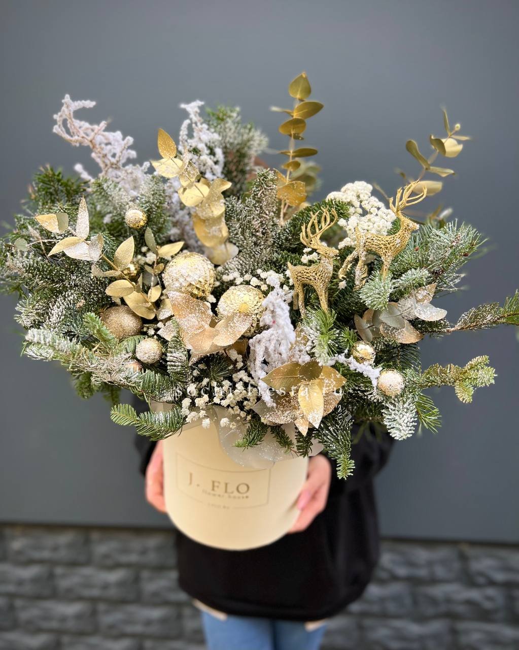 Датский нобилис и ель образуют основу праздничной композиции в кашпо. Свеча и ёлочные игрушки дополняют образ, создавая готовое решение для новогоднего интерьера.